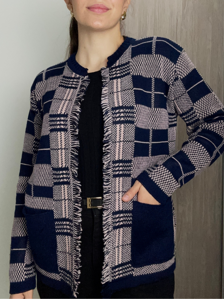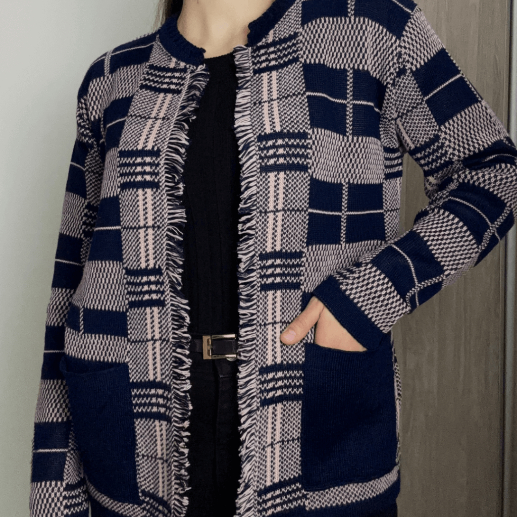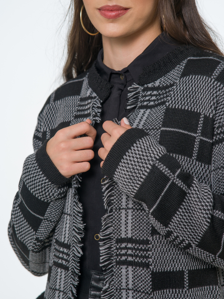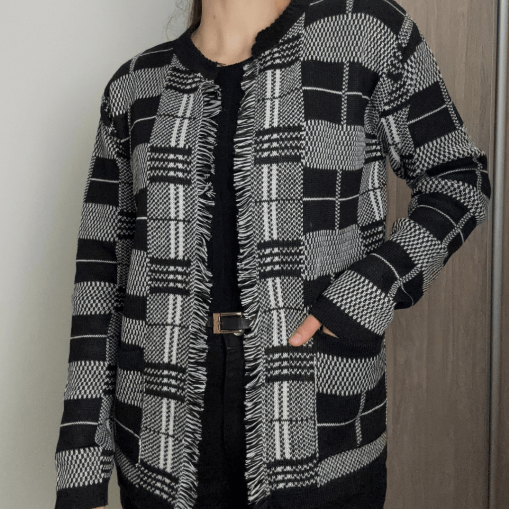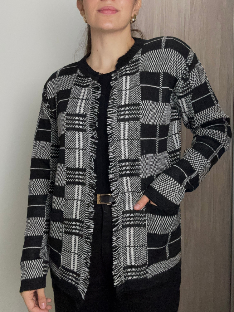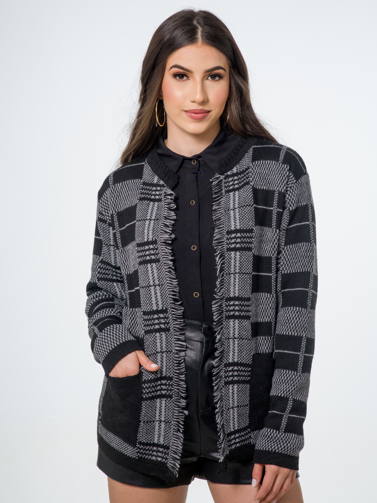 Casaco Cardigã Blusa Feminino De Frio Xadrez com Franjas Tricô Manga Longa Luxo