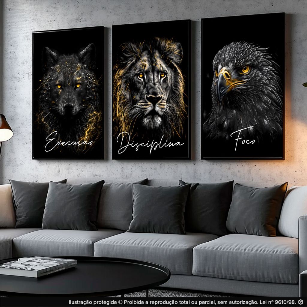 Conjunto 3 Quadros Decorativos Motivação Disciplina Foco Execução Dourado Moderno Luxo Sala Quarto Hall