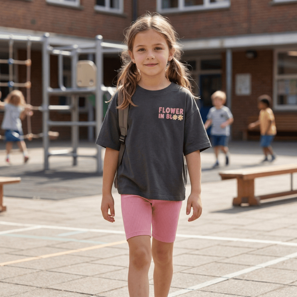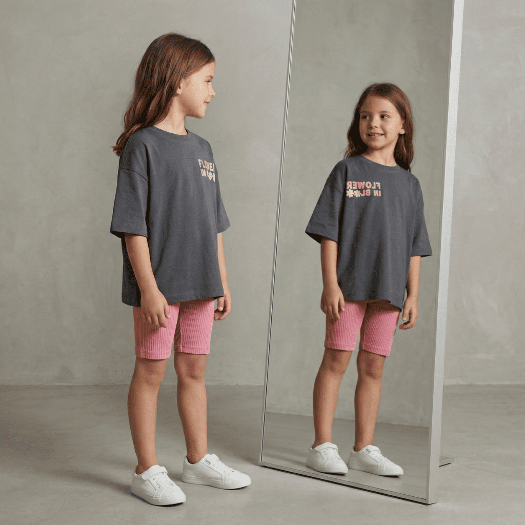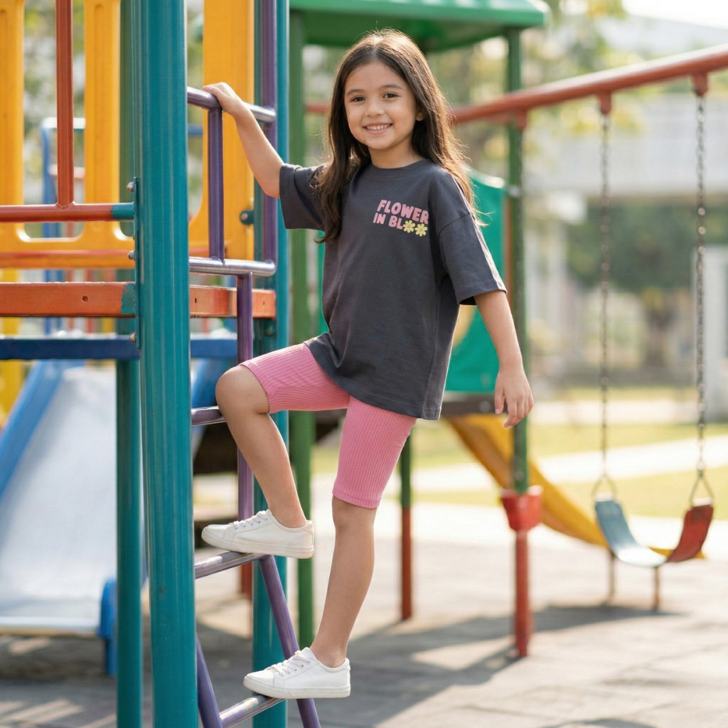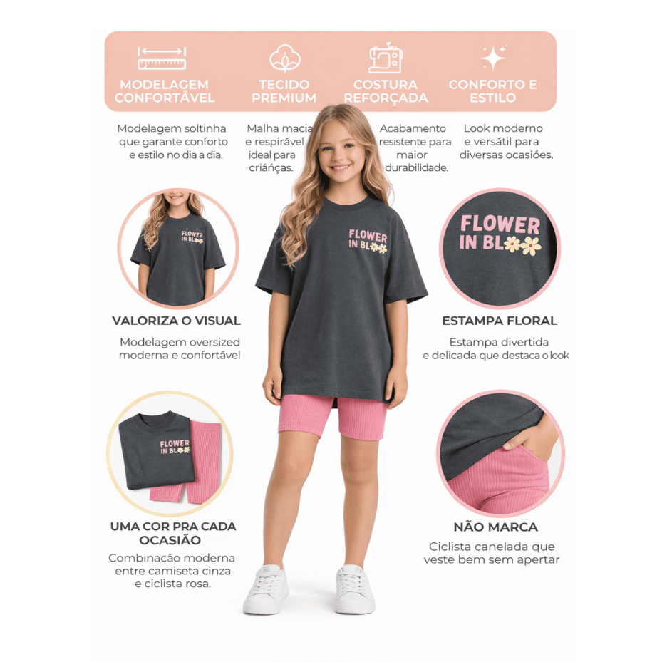 Conjunto Infantil Menina Camiseta Estampada over Size Short Ciclista Ribana Rosa