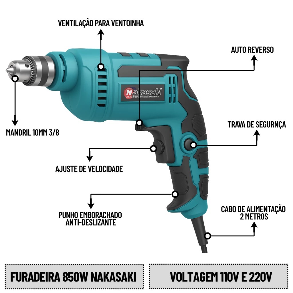 Furadeira Parafusadera 850W 3/8 Rotação Auto-Reversa Profissional Potente Envio Imediato