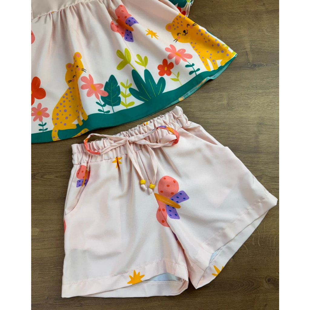 Conjunto Infantil Menina Onça Flores e Borboletas Blusa Manga Godê Short Confortável