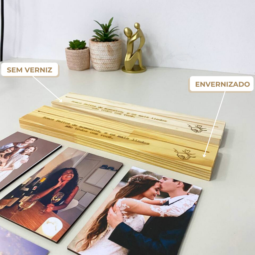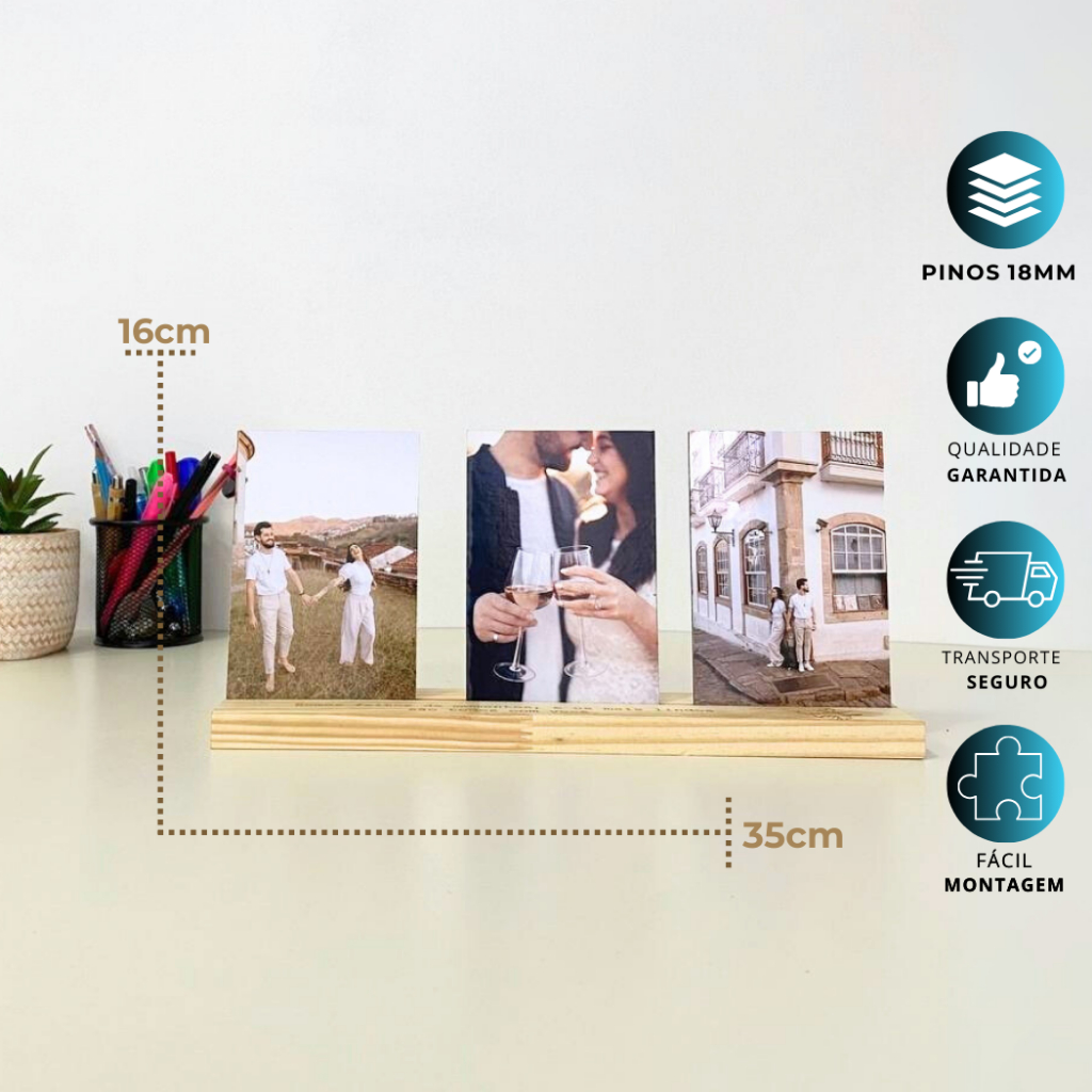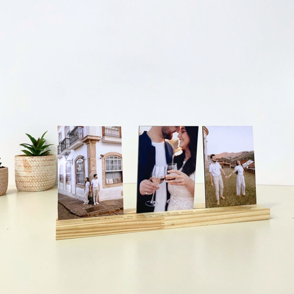 Porta Retrato com Base Madeira Presente Romântico Decorativo Casal Viagem 3 Foto 10x15