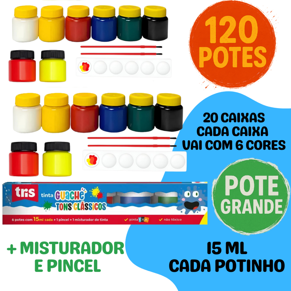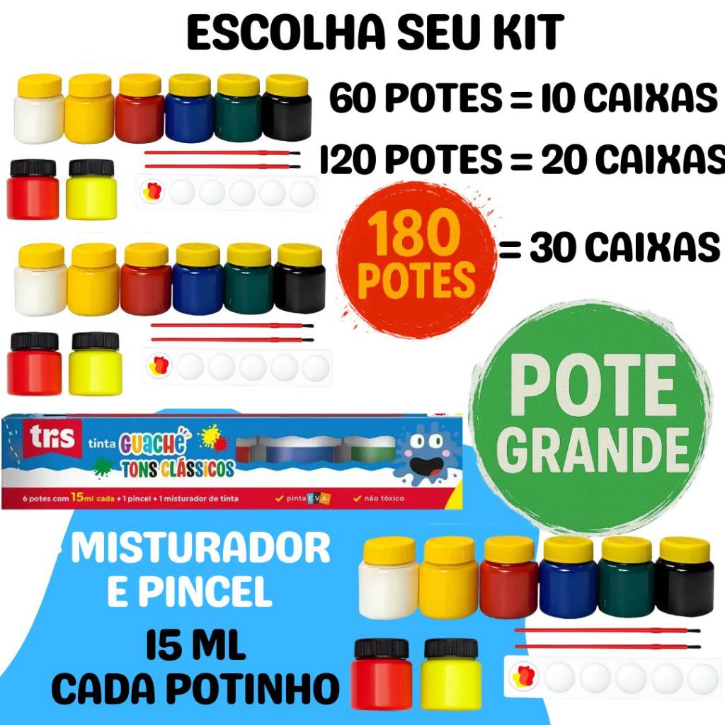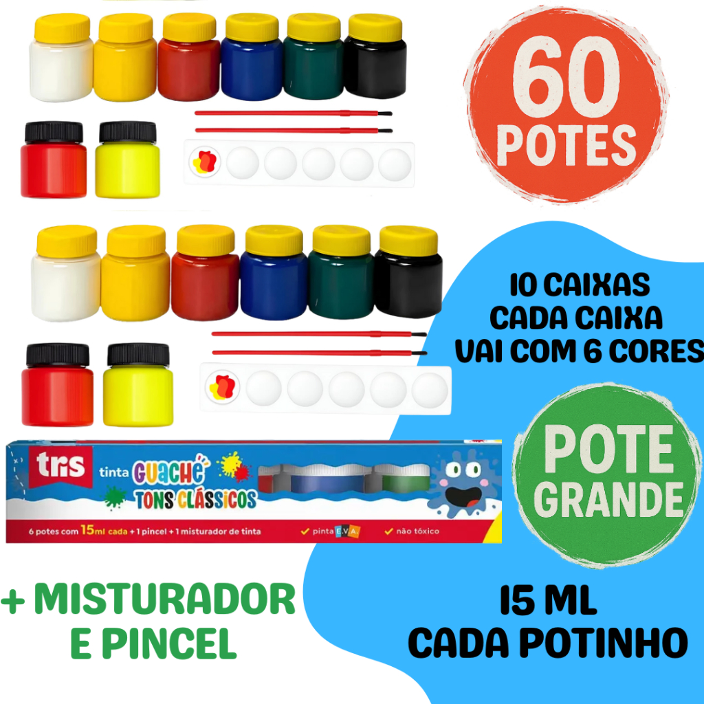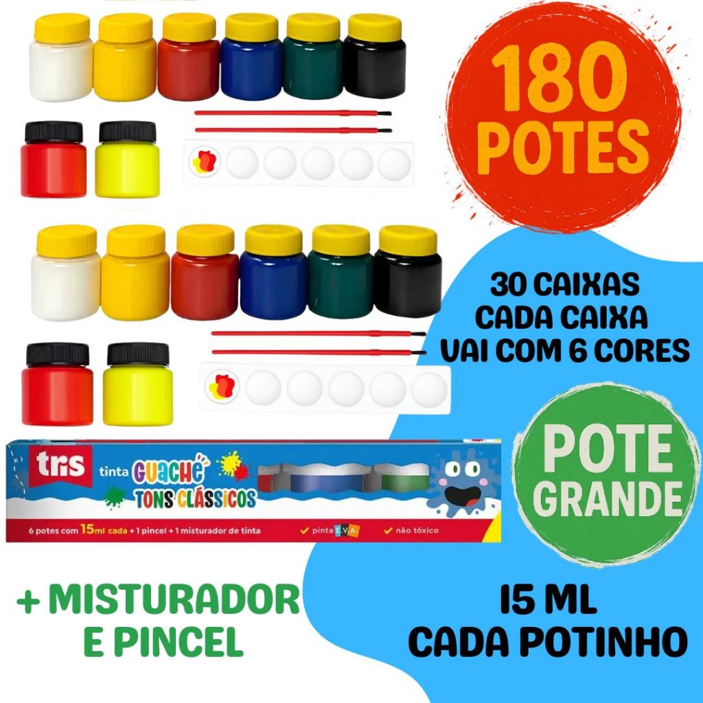 Kit 360 Potinhos Tinta Guache Lembrancinha Festa Escola Pintura Aquarela 30 Pacotes Com 12 Cores Cada + Pincéis