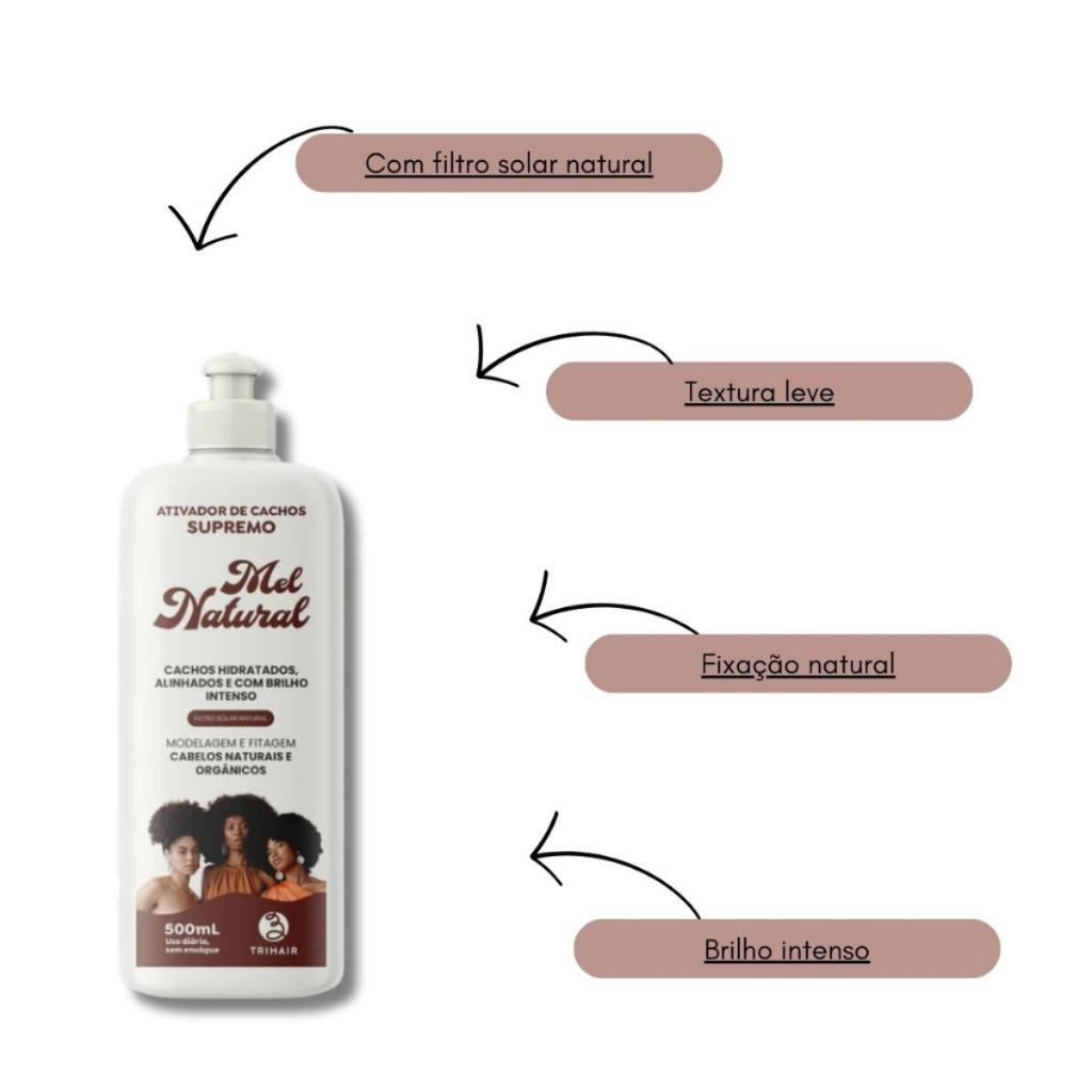 Mel Cola Modelador Trihair 1kg + Ativador de Cachos Mel Natural 500ml + BRINDE (Pente 3 fileiras)