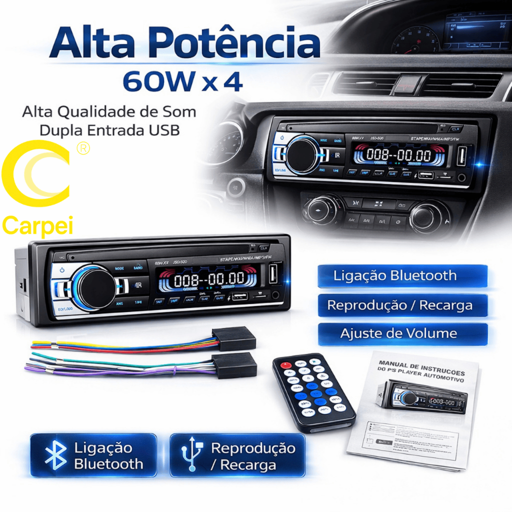 Aparelho De Som Automotivo Rádio 25W De Carro Bluetooth Pendrive SD Rádio Aux In Mp3 Player Multicolor Visor Led JSD-520