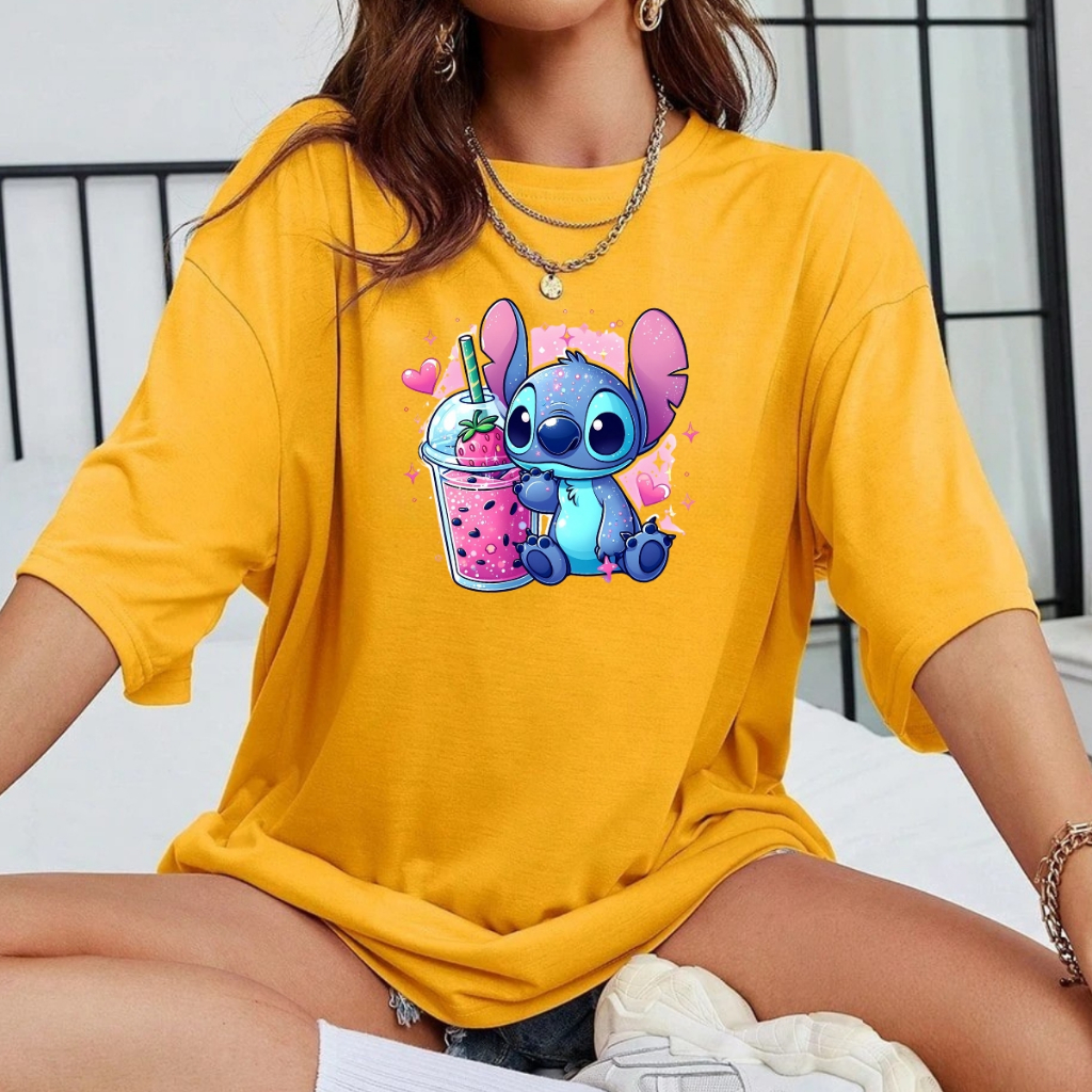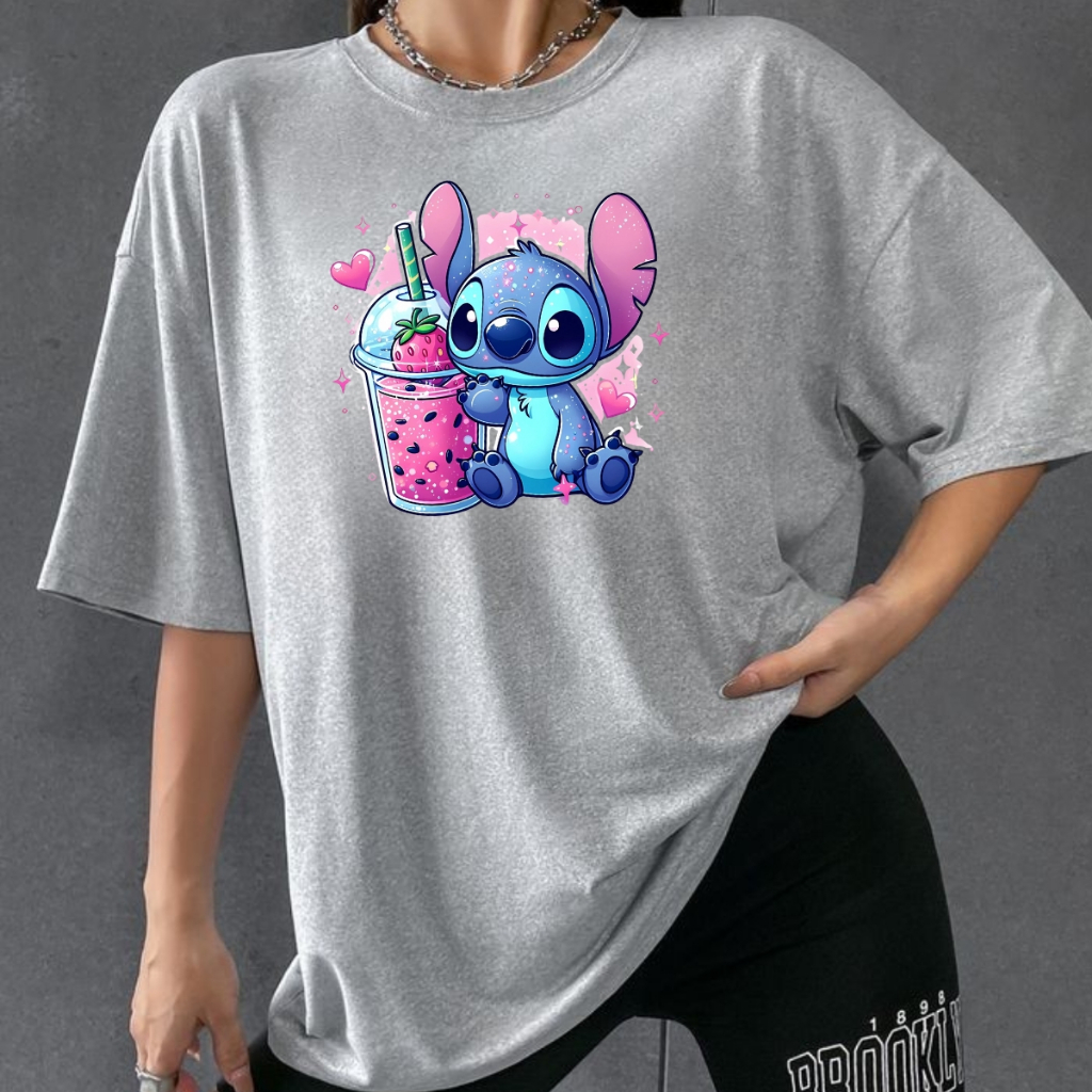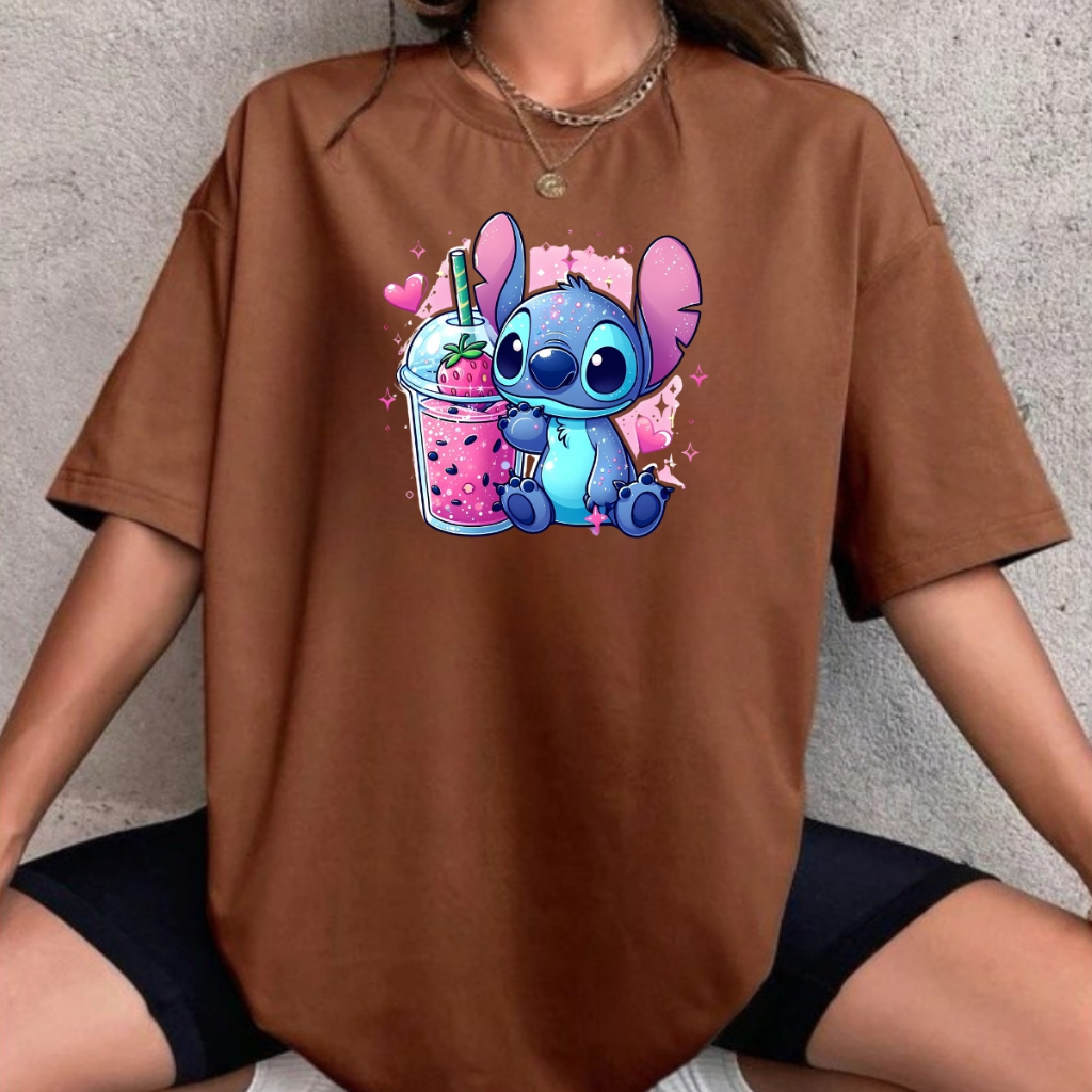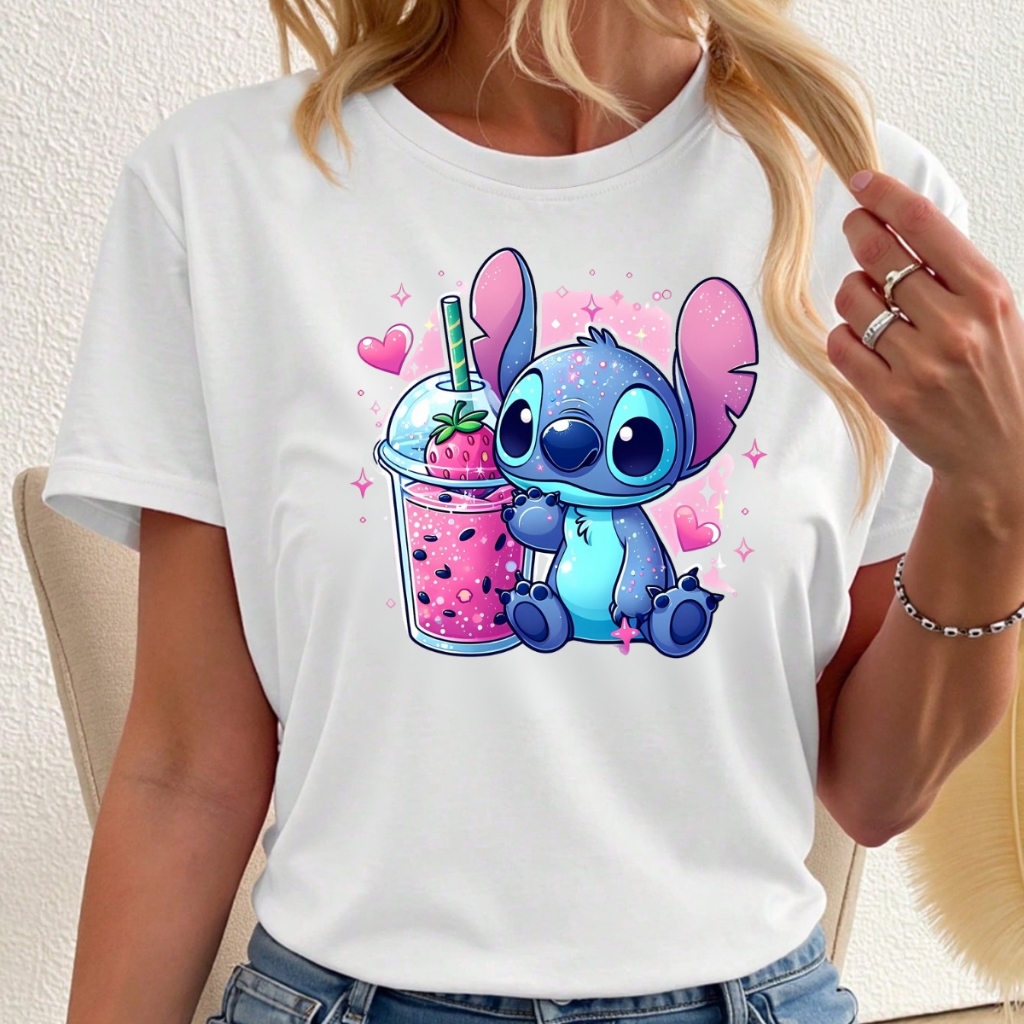 Camiseta Personalizada Desenho Stitch Fofinho Tomando Milk Shake 100% Algodão Unissex