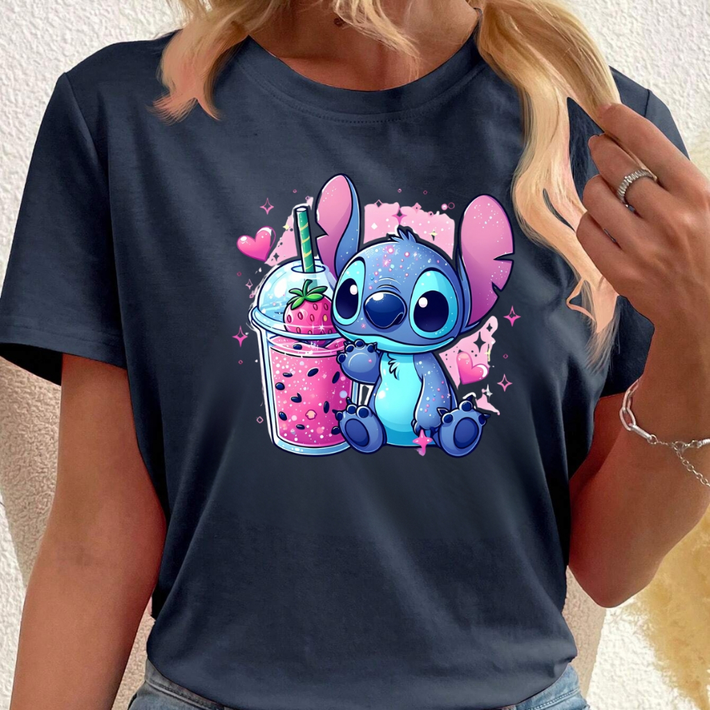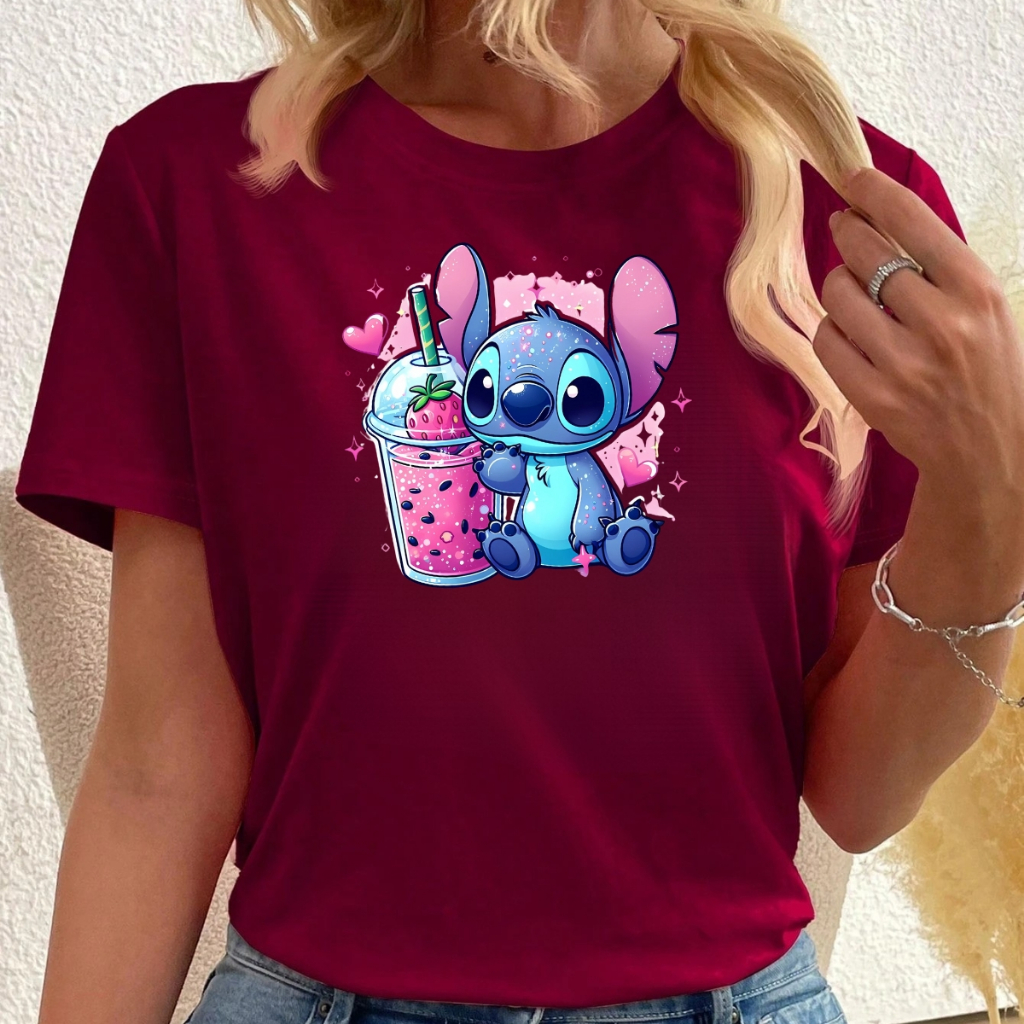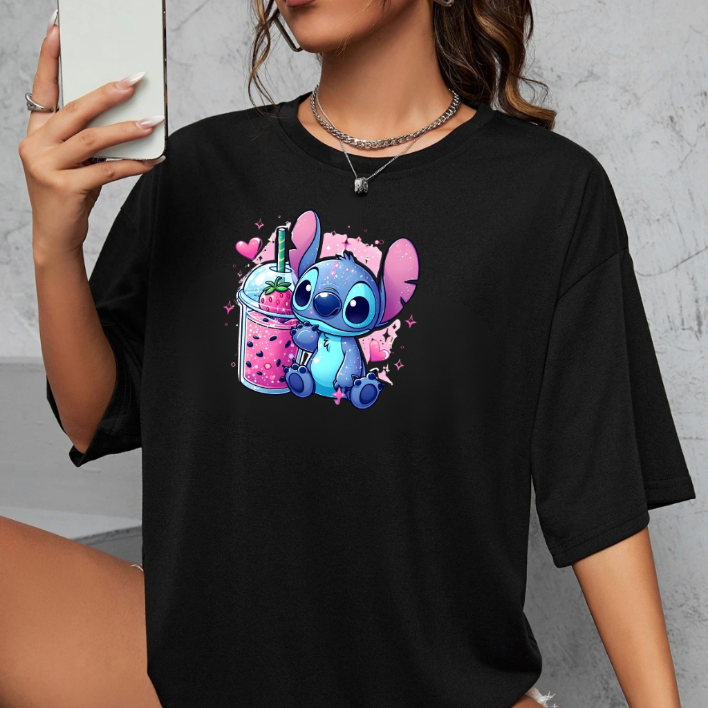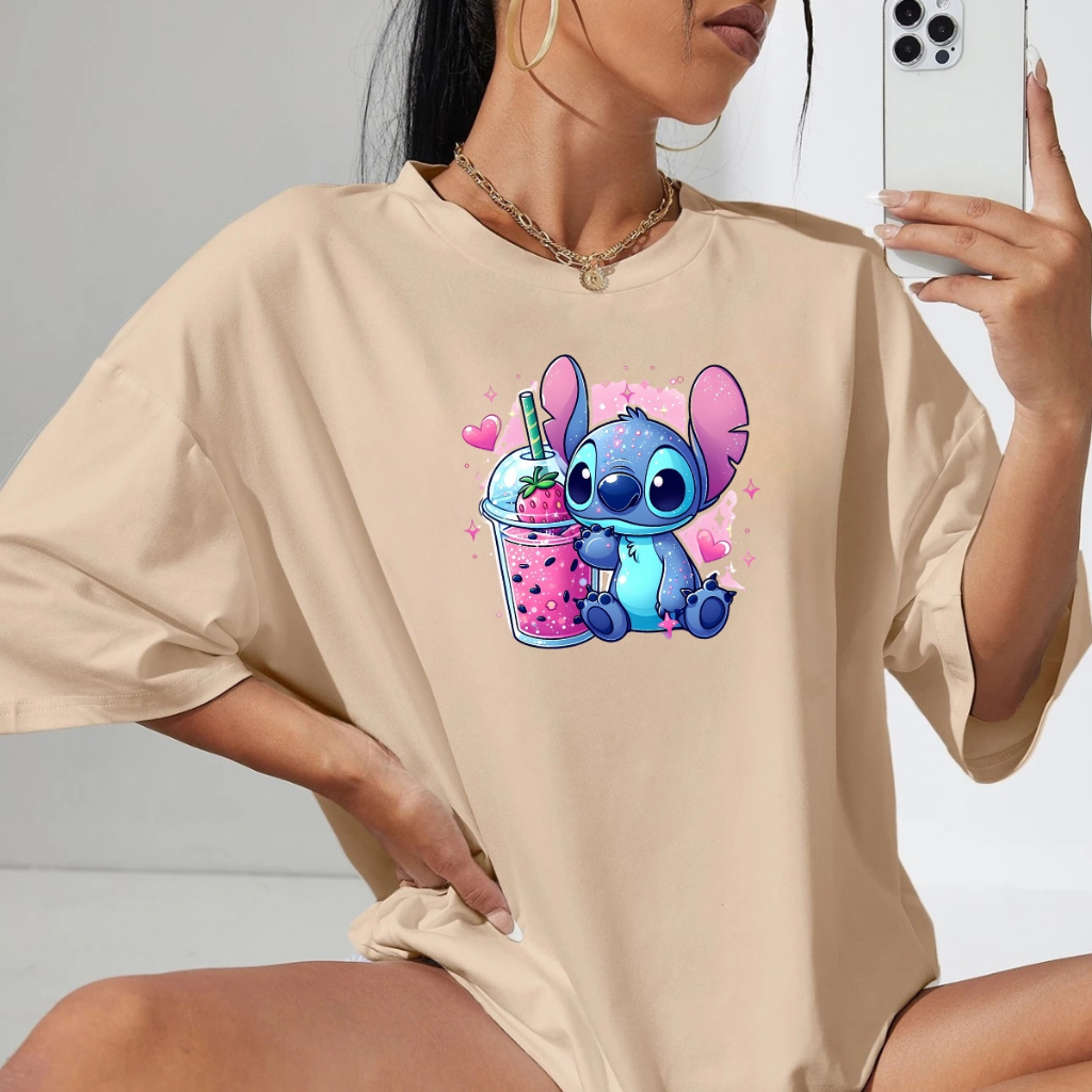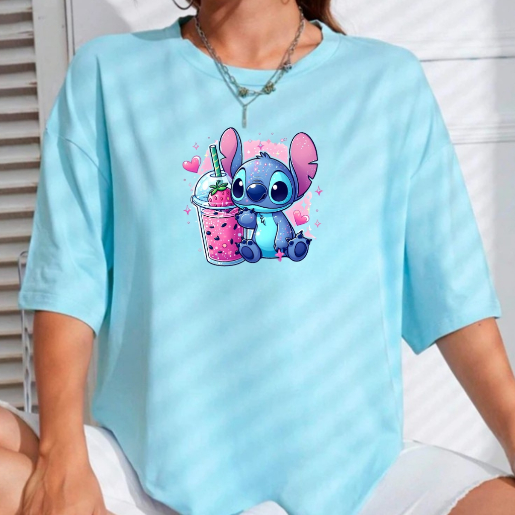 Camiseta Personalizada Desenho Stitch Fofinho Tomando Milk Shake 100% Algodão Unissex