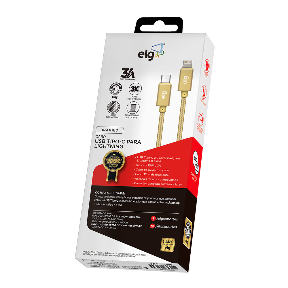 Cabo USB Tipo-C para Lightning, Sincronização e Carga Rápida 15W 3A, 1 metro, TCL10BG, ELG
