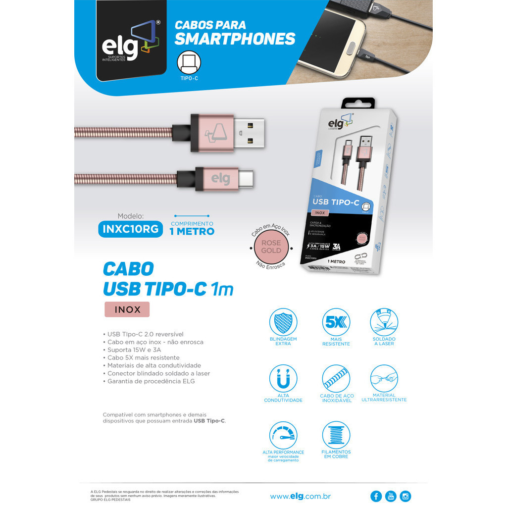 Cabo USB Tipo-C, Sincronização e Recarga 15W 3A, Aço Inox, 1 metro, Rose Gold, INXC10RG, ELG