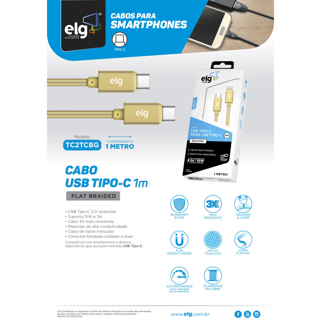 Cabo USB Tipo-C para USB Tipo-C, Carga Rápida 15W 3A, 1 metro, Dourado, TC2TCBG, ELG