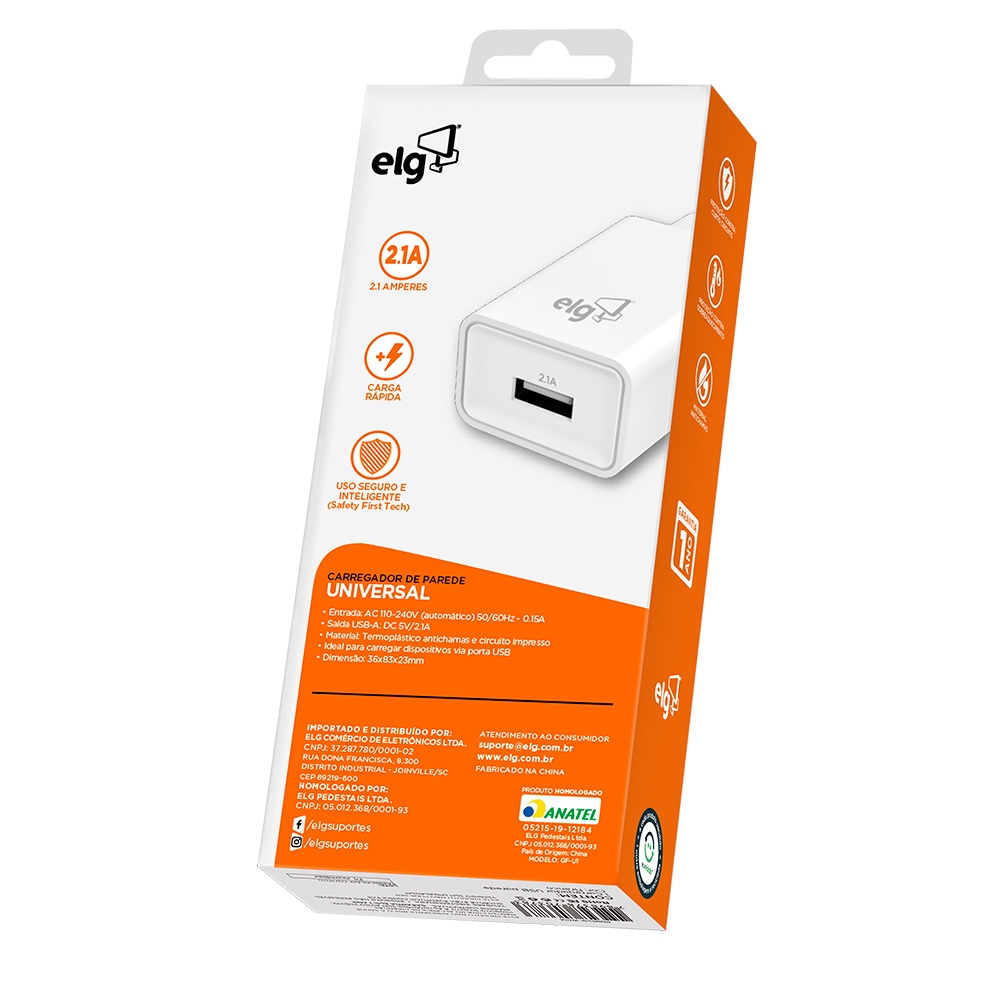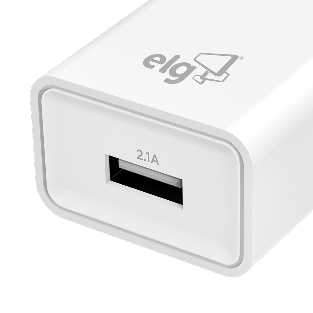 Carregador USB Universal, 1 Porta USB 2.1A, Carga Rápida, Proteção Inteligente, Branco, WC1A, ELG