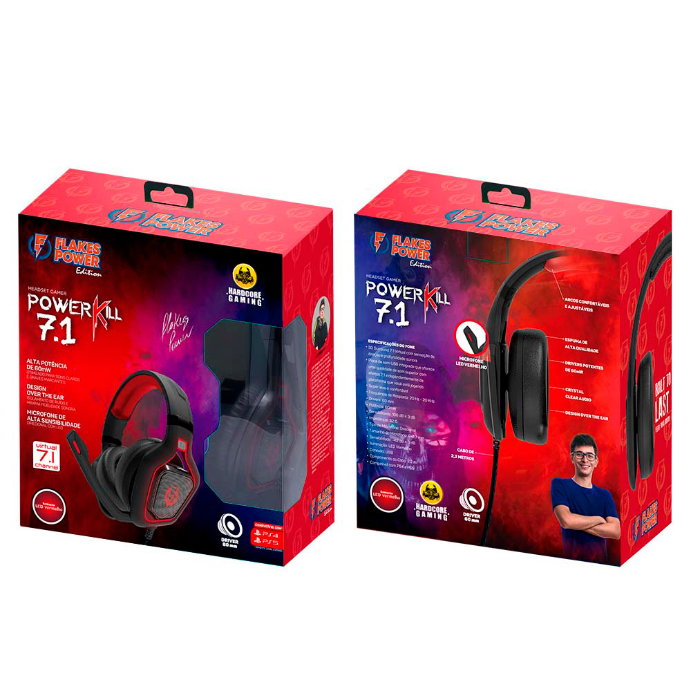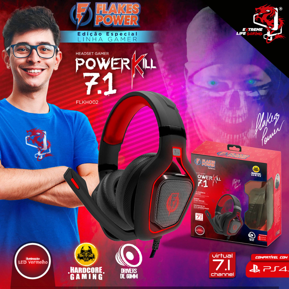 Headset Gamer Flakes Power Kill 7.1 Virtual, Drivers 60mm, LED vermelho, Microfone USB, FLKH002, ELG