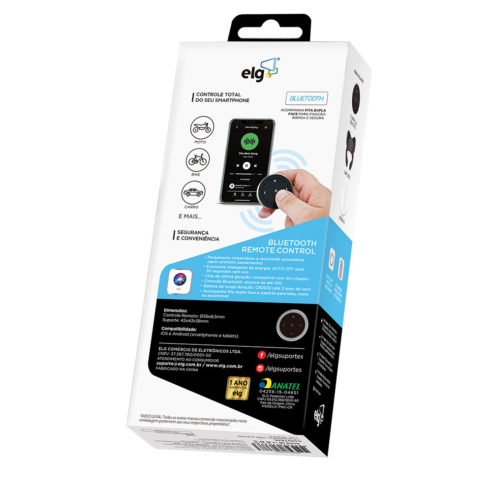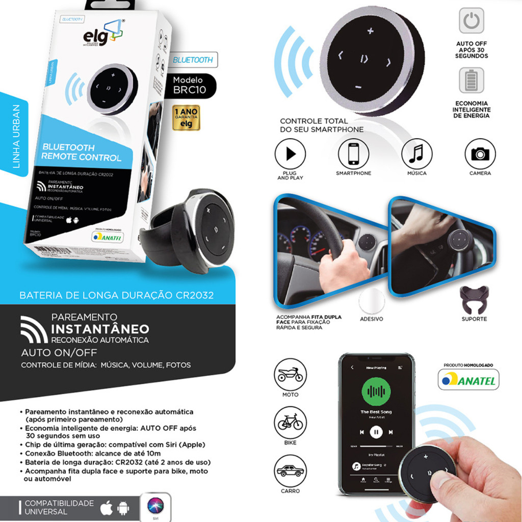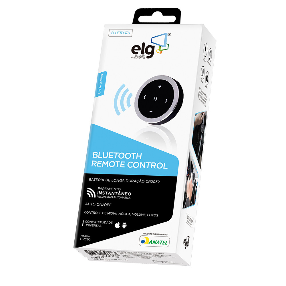 Controle Remoto de Mídia Bluetooth, Para Smartphones, Mídia e Câmera, Alcance 10m, Preto, BRC10, ELG