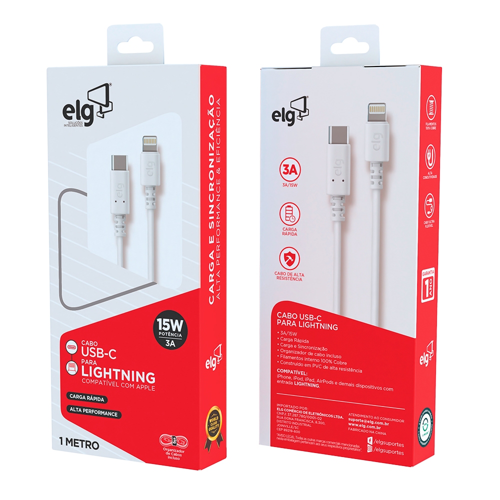 Cabo USB-C para Lightning, Carga Rápida 15W 3A, 1 metro, Branco, TCL10, ELG