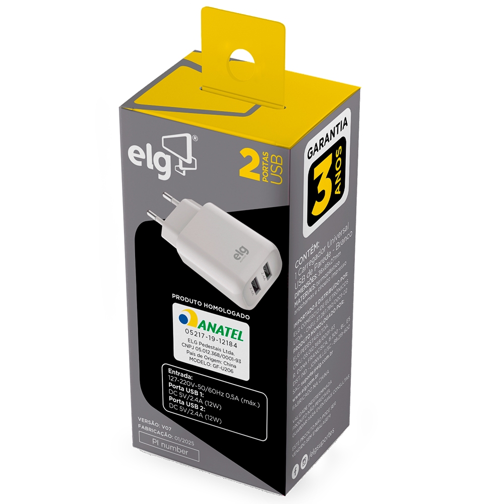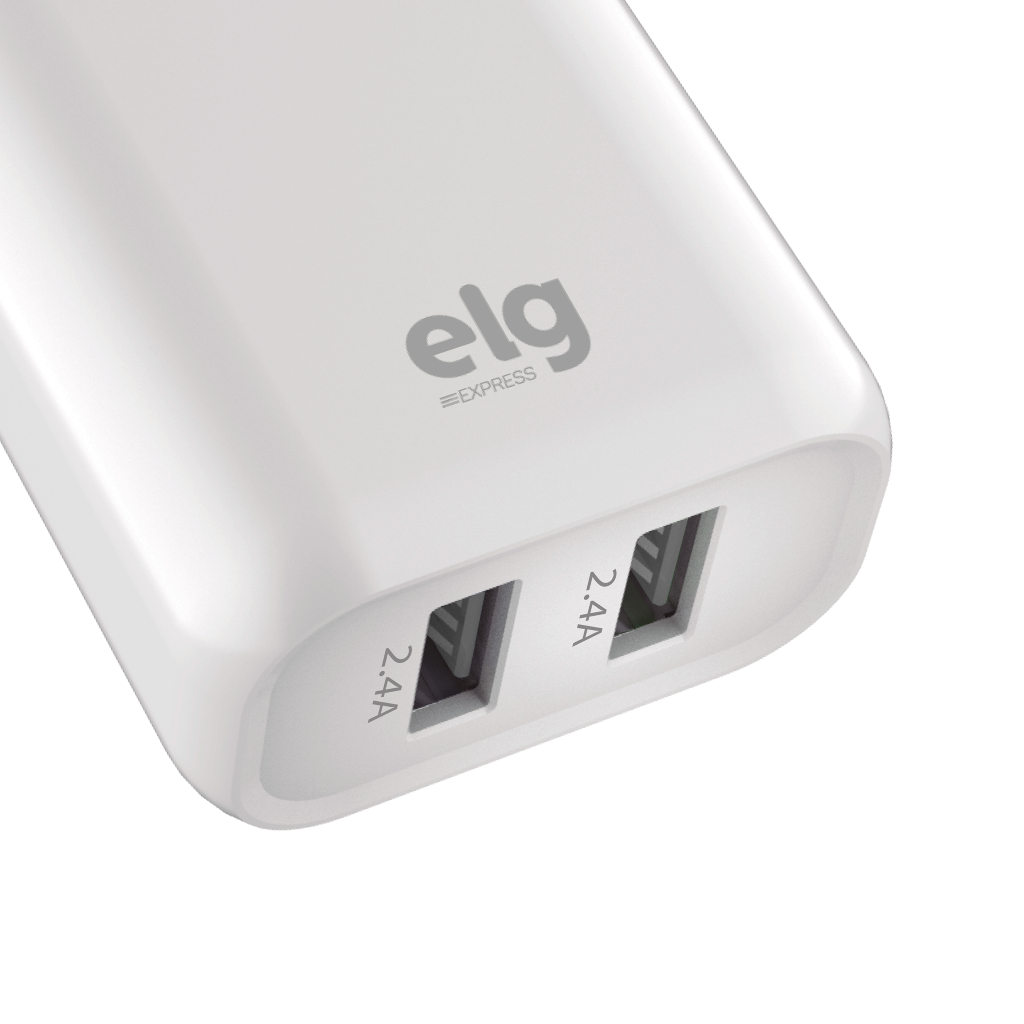Carregador USB Universal, 2 Portas USB 2.4A, Carga Rápida, Proteção Inteligente, Branco, WC124E, ELG