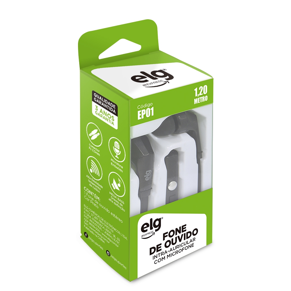 Fone de Ouvido, P2 3,5mm Microfone Embutido Graves Reforçados Cabo Flat 1,2 metros Preto EP01 ELG