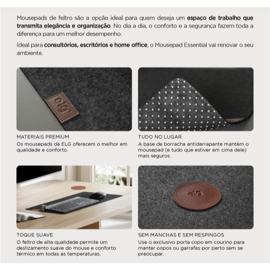 Mousepad Essential Office, Feltro 60x30cm, Porta Copo, Antiderrapante, Bordas Costuradas, MPEL, ELG