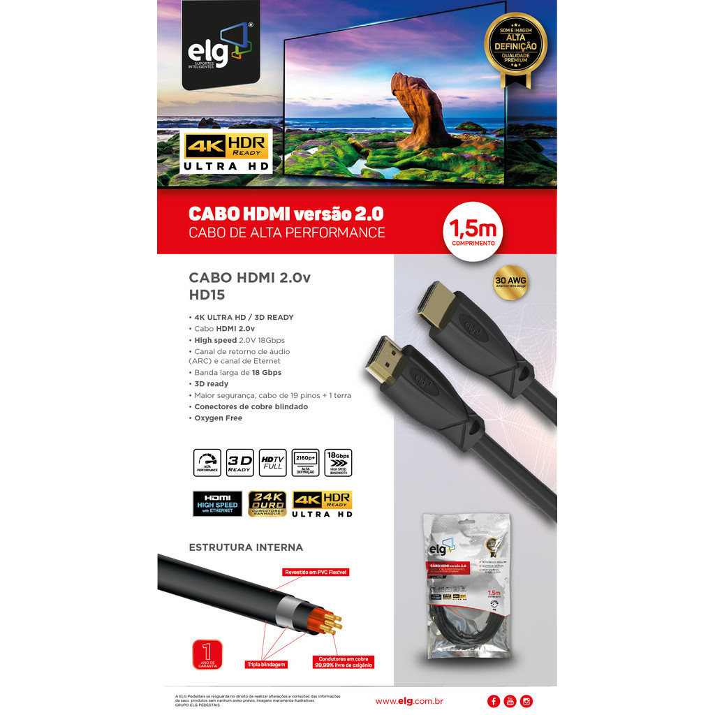 Cabo HDMI 2.0, 4K, 3D Ready, 1,5 metros, Preto, HD15, ELG