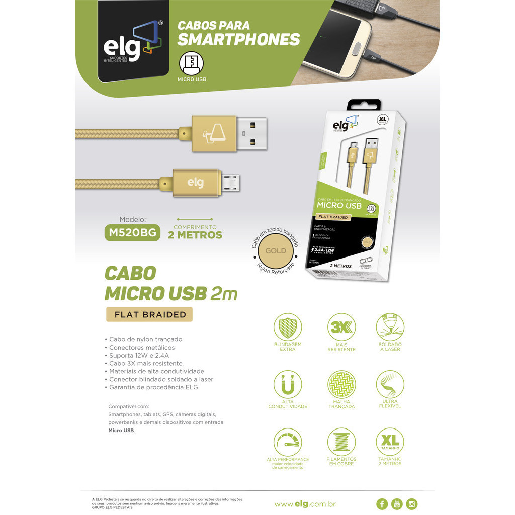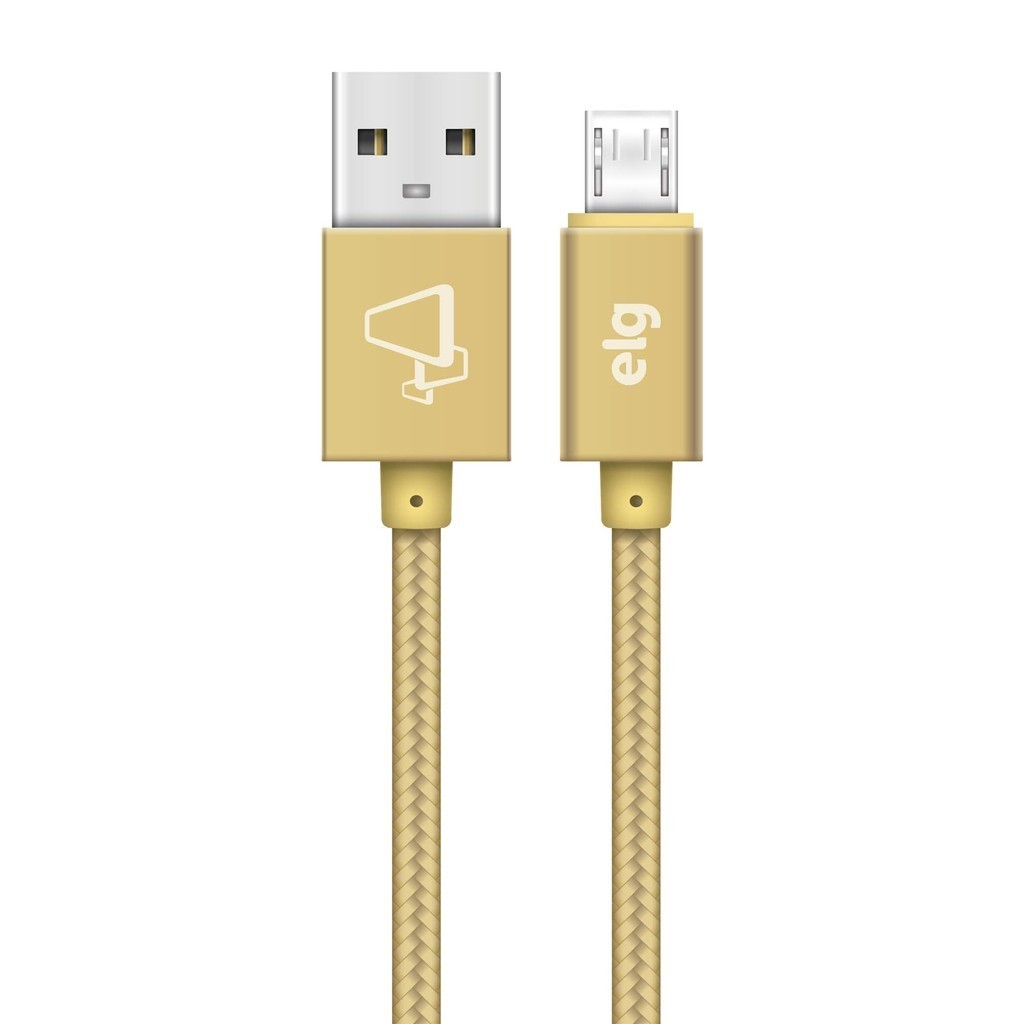 Cabo Micro USB, Sincronização e Recarga 12W 2.4A, Nylon Trançado, 2 metros, Dourado, M520BG, ELG