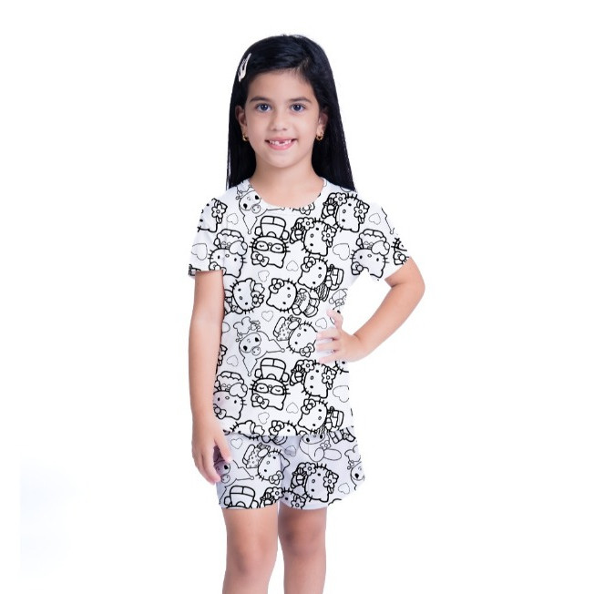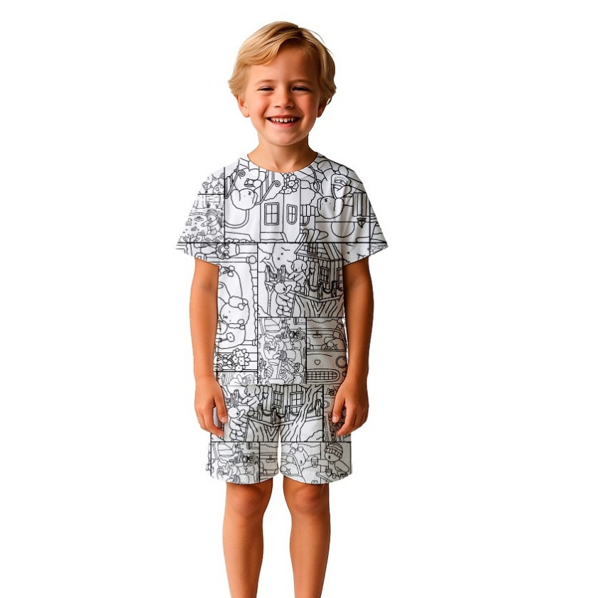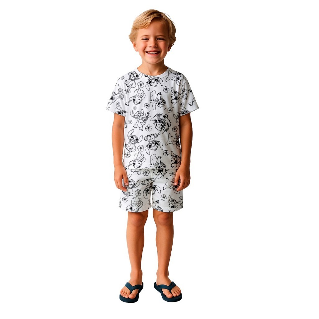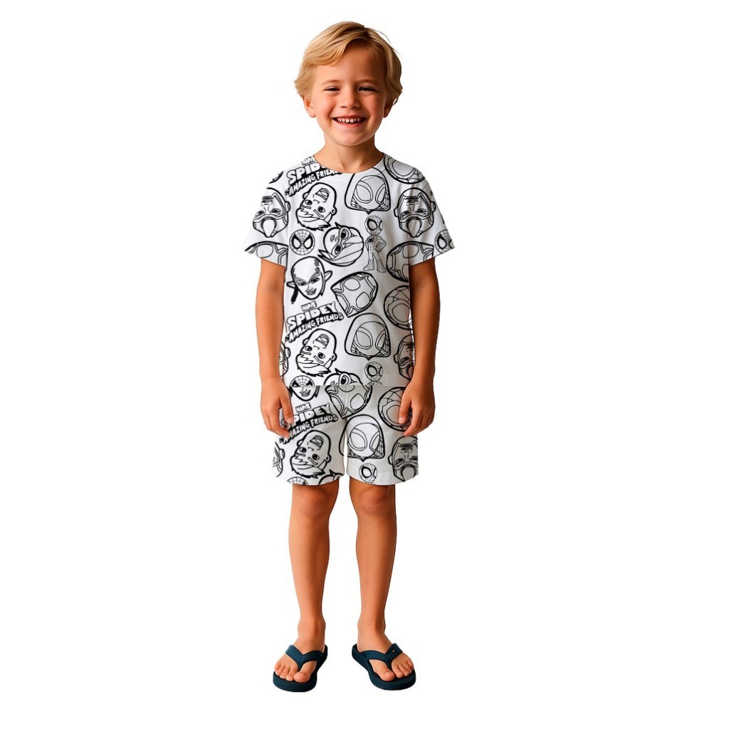 PIJAMA INFANTIL MANGA CURTA COM CANETINHA LAVÁVEL KIT PARA COLORIR DIVERTIDO ESTAMPADO PERSONAGENS