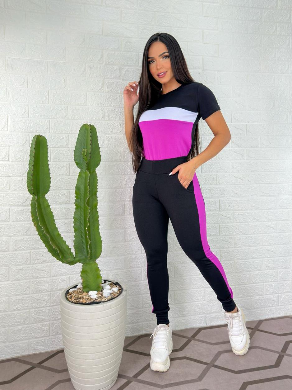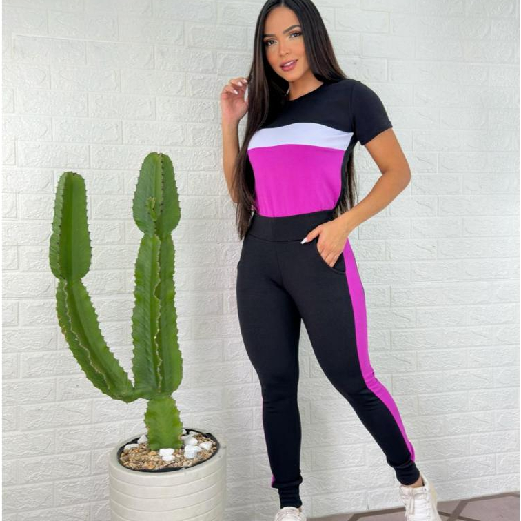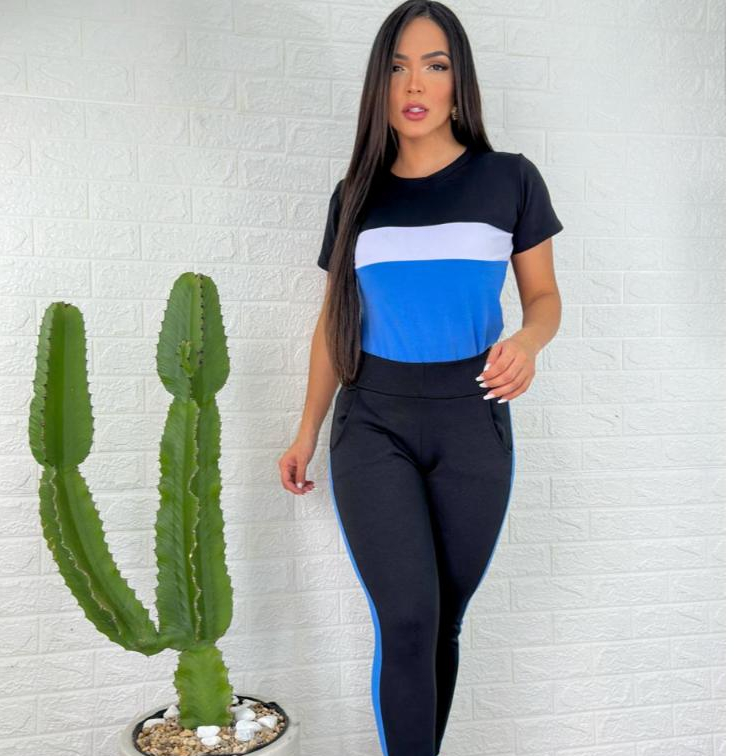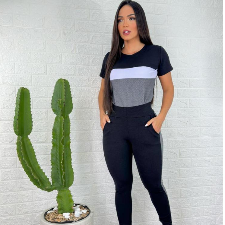 conjunto feminino manga curta e calça malha crepe comfortavél