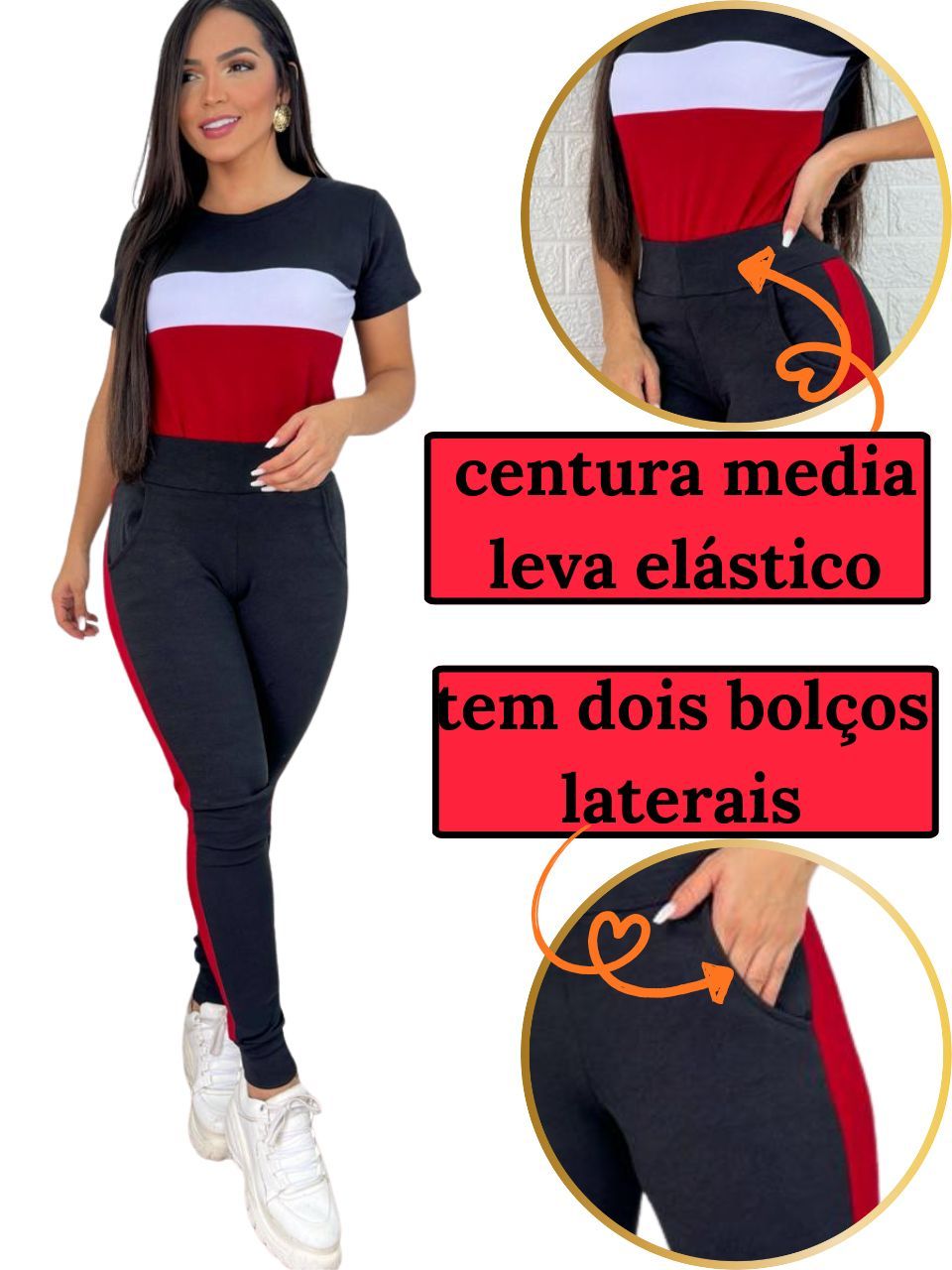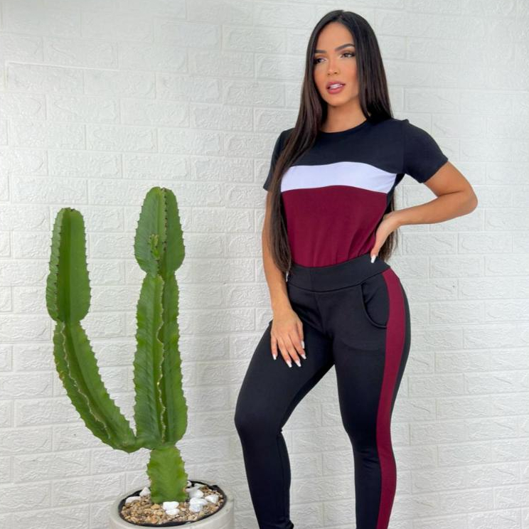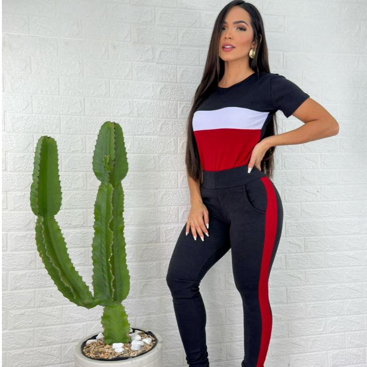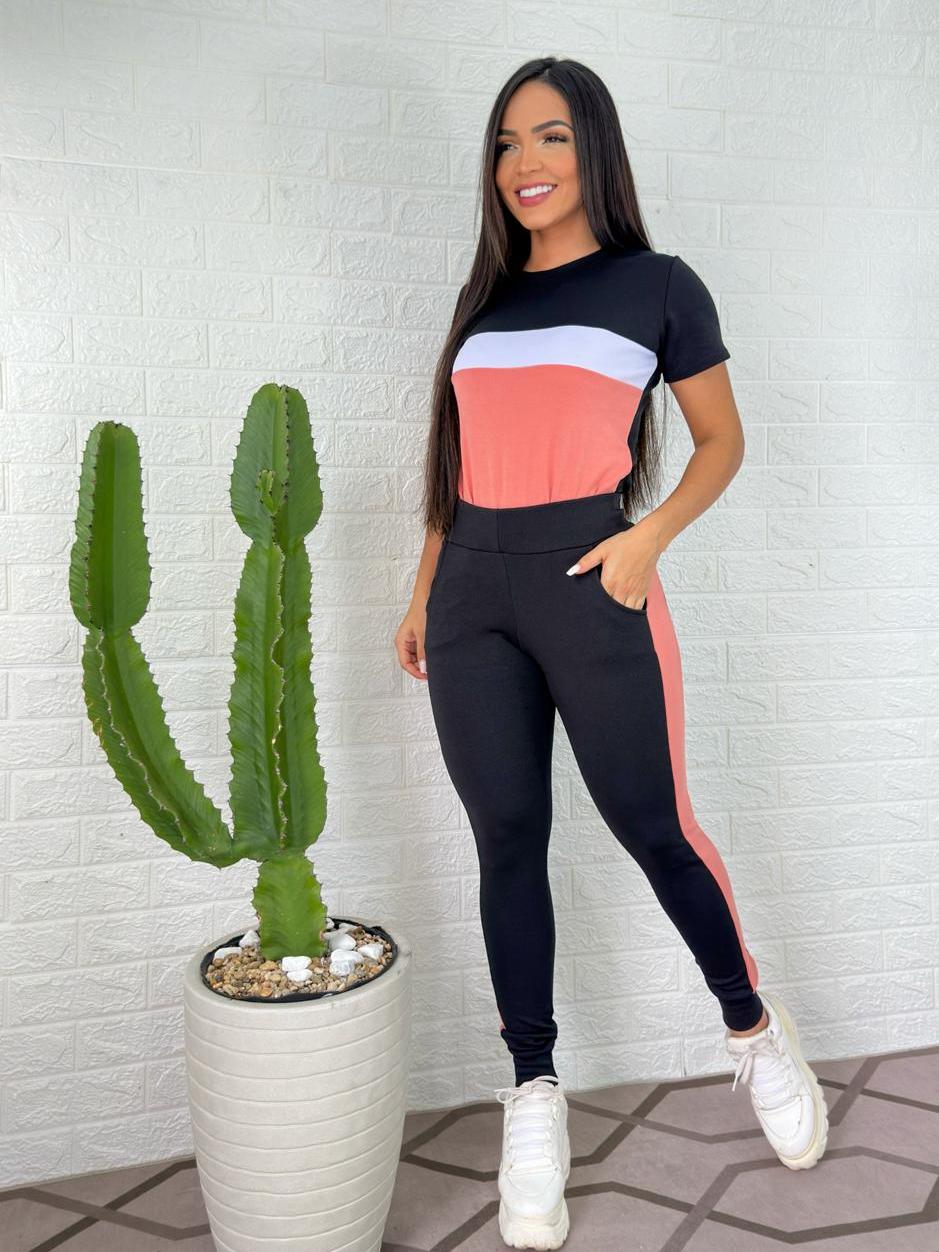 conjunto feminino manga curta e calça malha crepe comfortavél