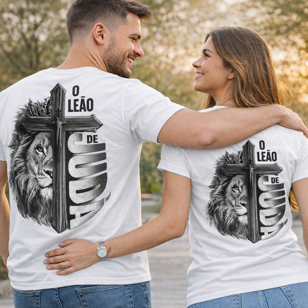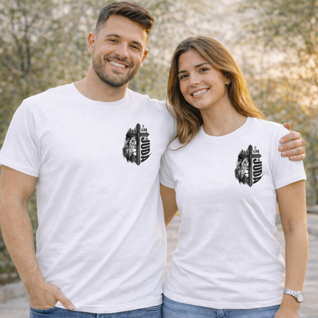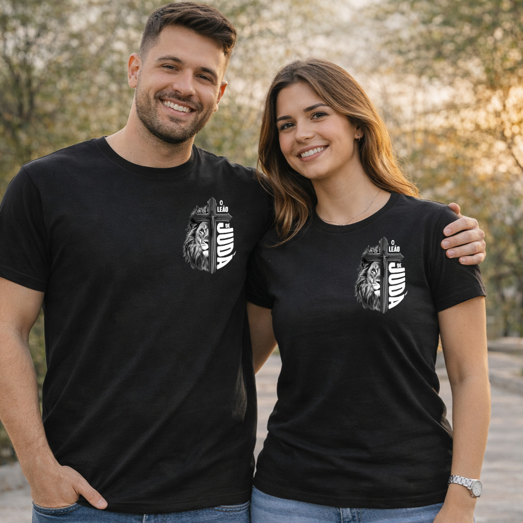 Kit Casal Camiseta Moda Cristã Unissex Leão de Judá Cruz Fé Camisa 100% Algodão Unisex