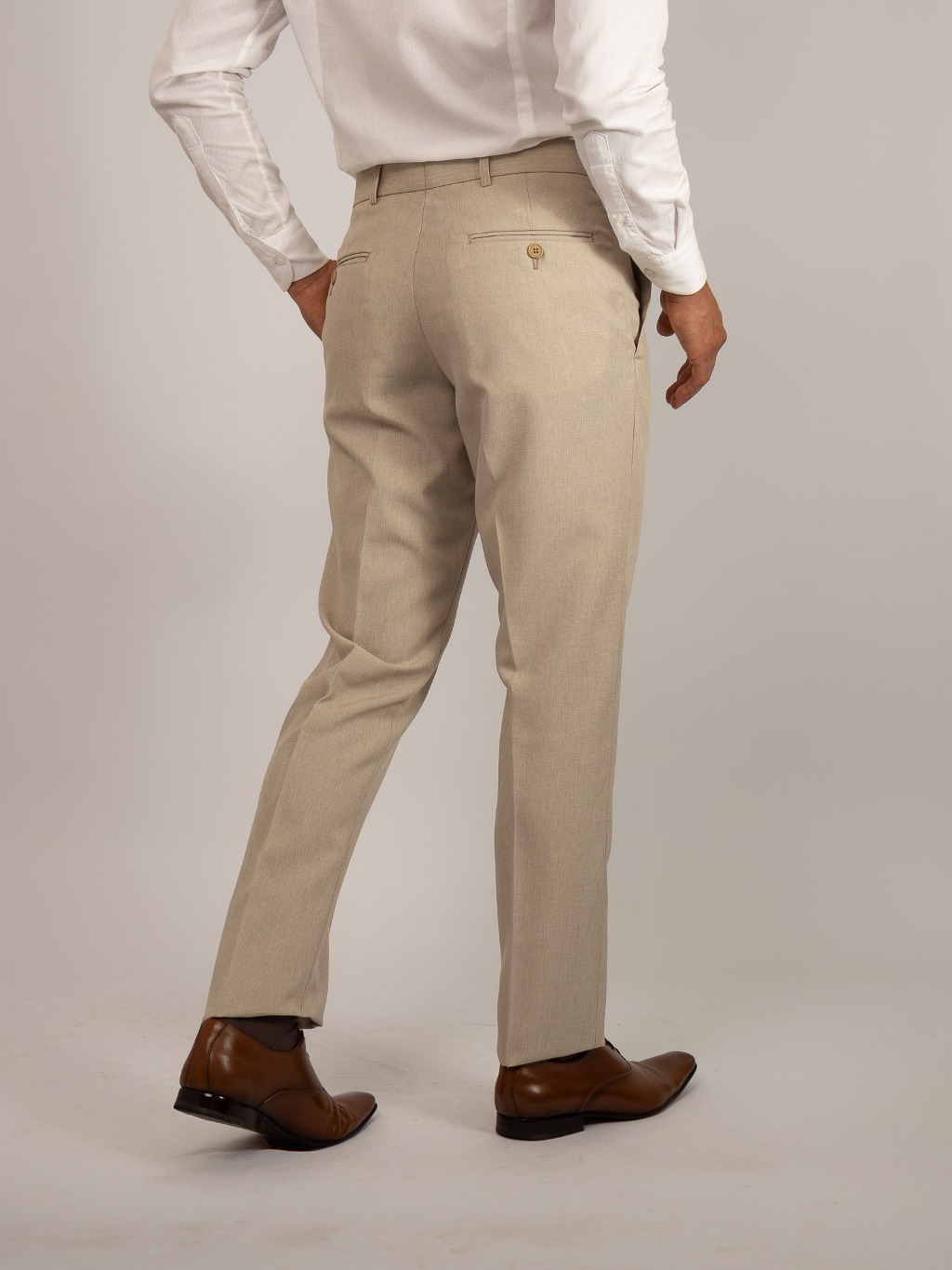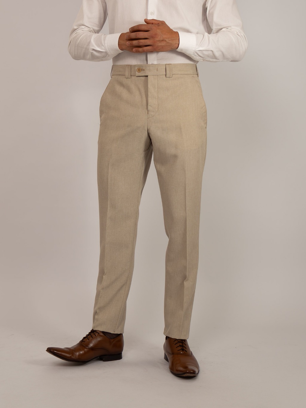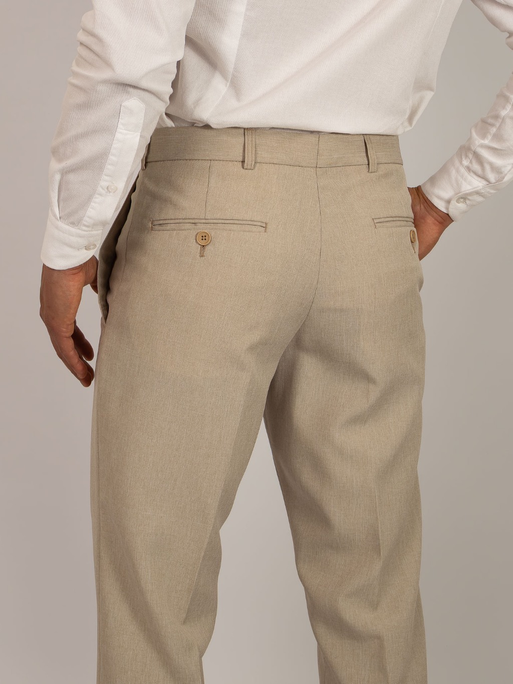 Calça Social Masculina Alfaiataria Slim Areia Textura tipo Linho, Cós Transpassado, Sem Barra