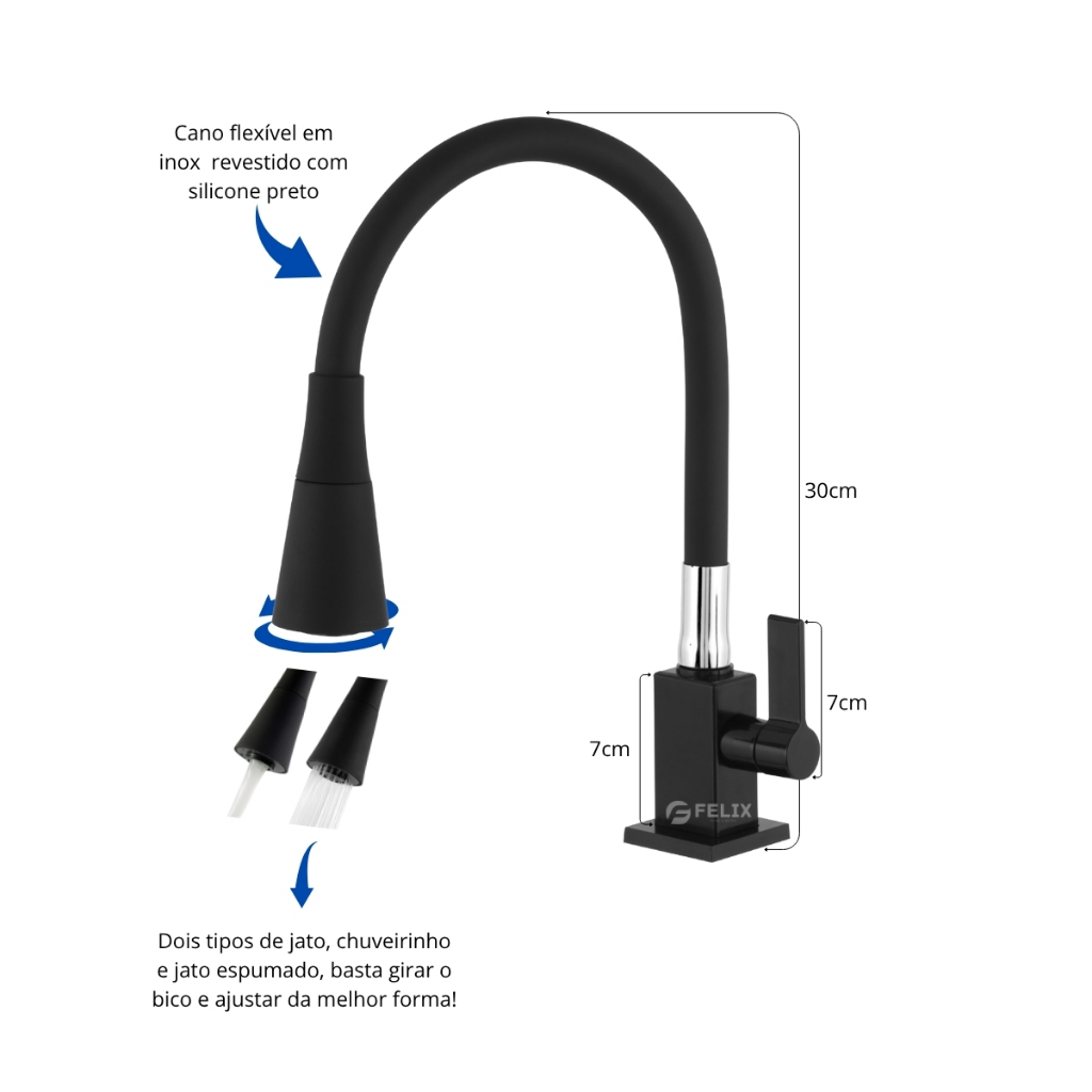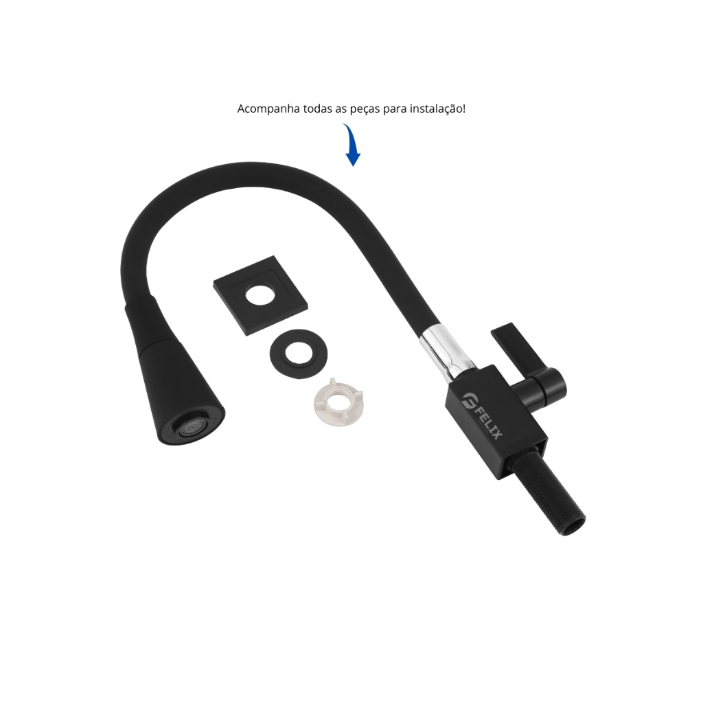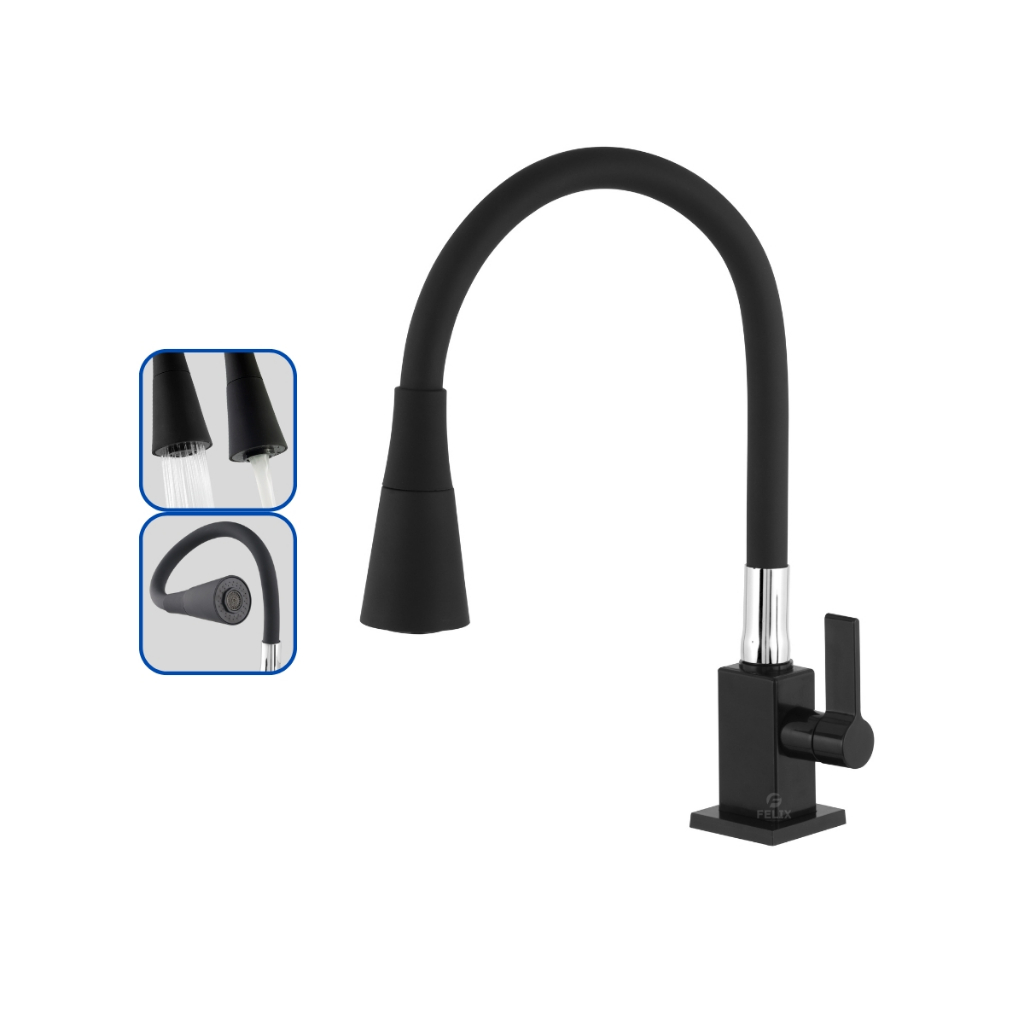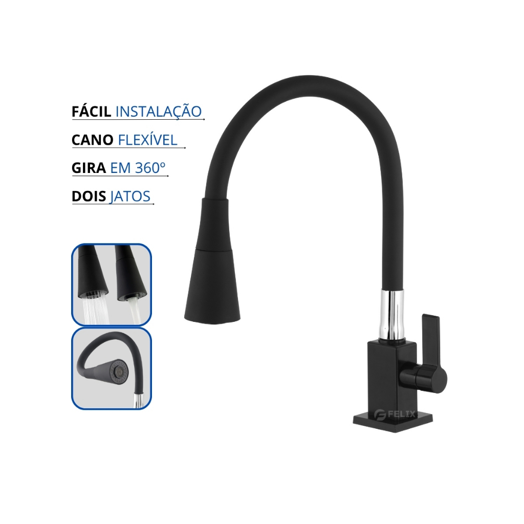 Torneira de Cozinha Quadrada Preta Gourmet Flexível Bancada com Ducha Chuveirinho 2 Jatos Cromada 1/4 de Volta Chuveiro