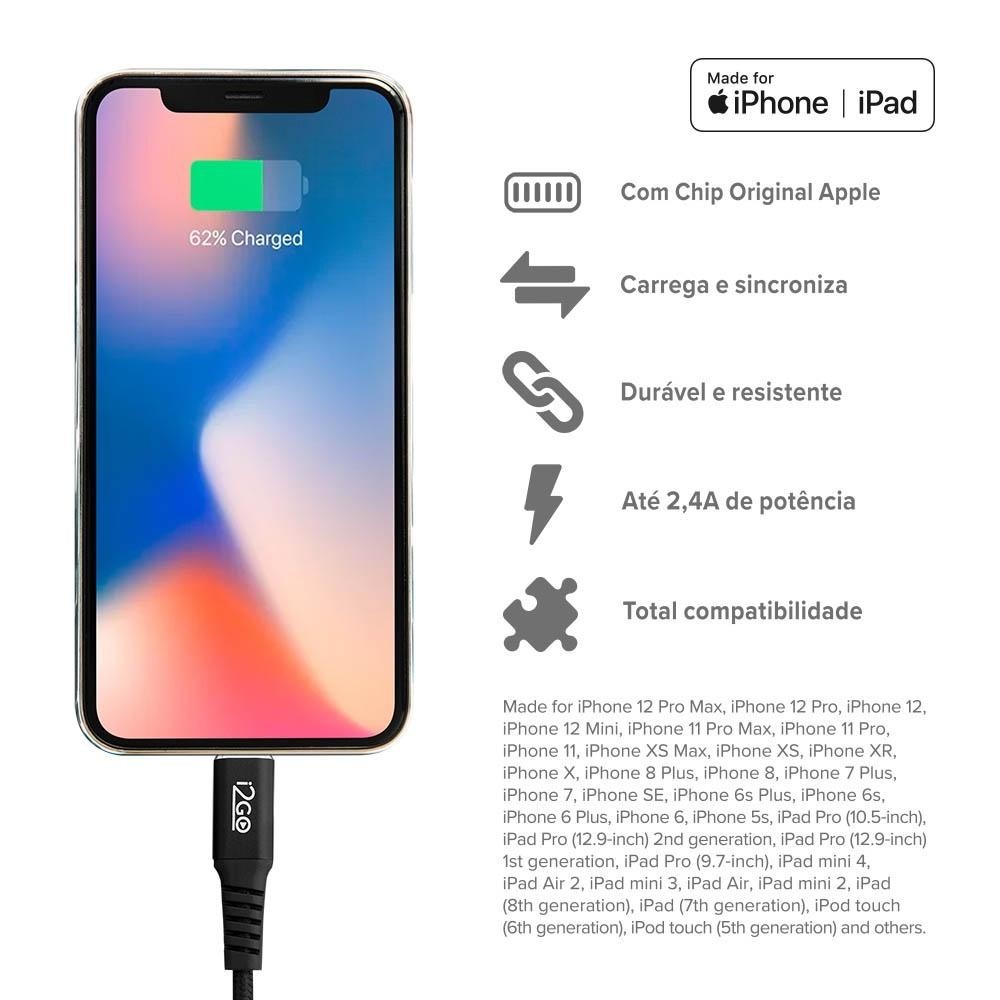 Cabo Lightning i2GO Certificado Mfi 2m 2,4a Preto