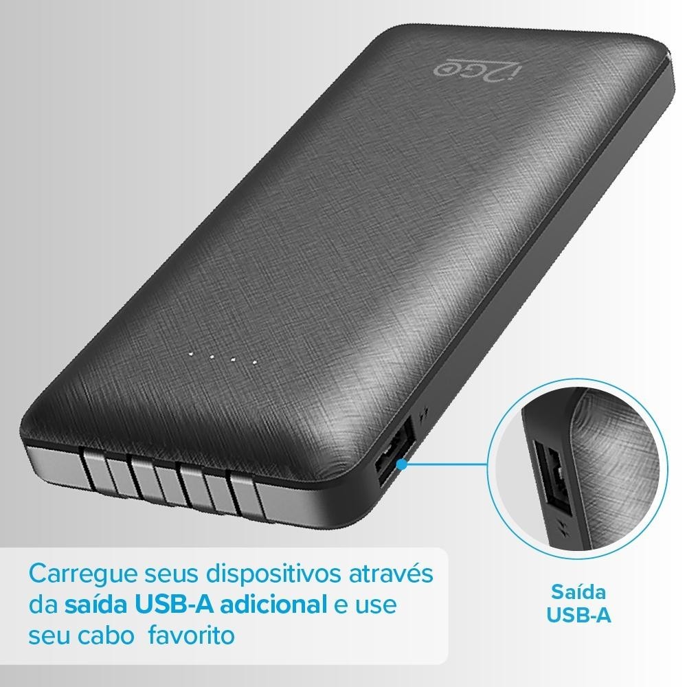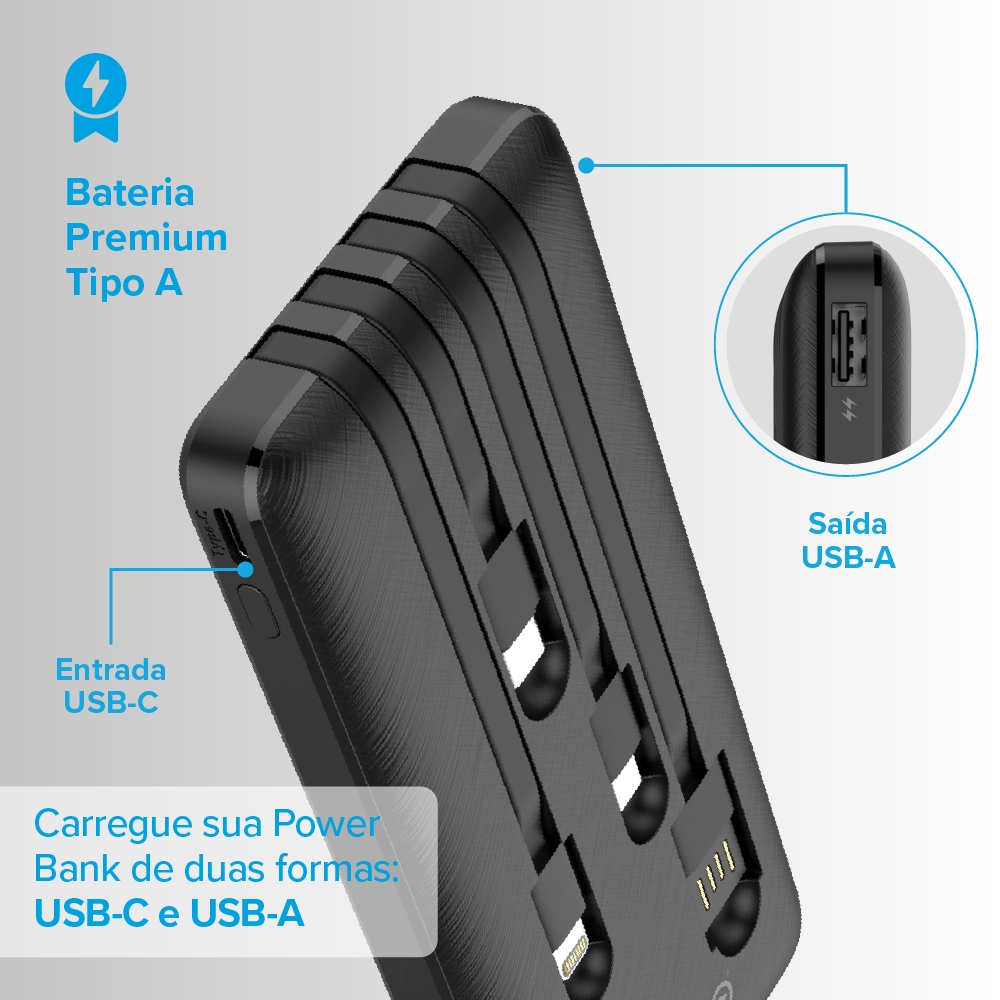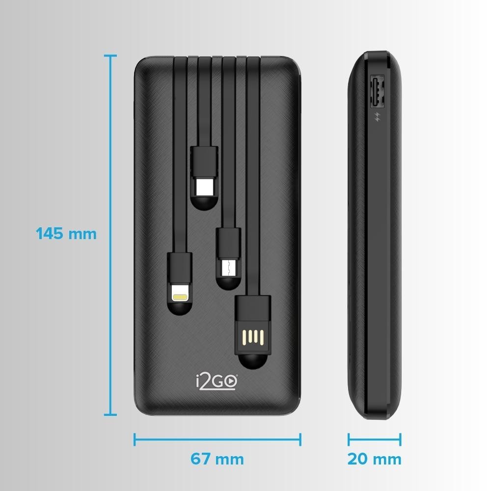 Carregador Portátil (Power Bank) i2GO 10000mAh 4 Em 1 Com Cabos Acoplados (Micro-USB, USB-C, Lightning e USB-A) Preto