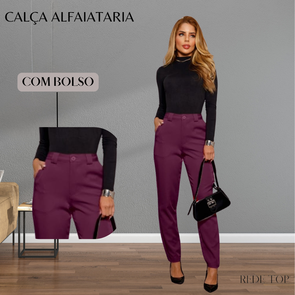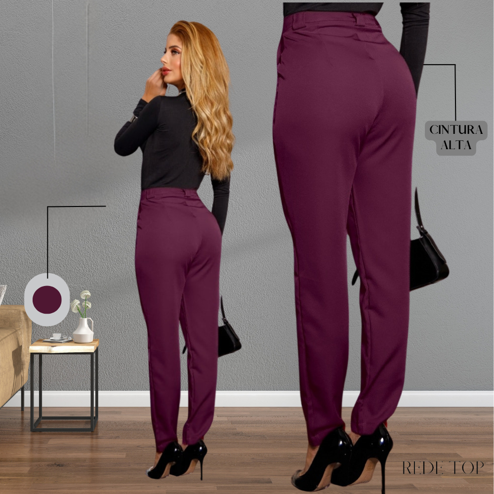 Calça Social Feminina Uniforme Cintura Alta Skinny Alfaiataria Com Bolsos e Passantes