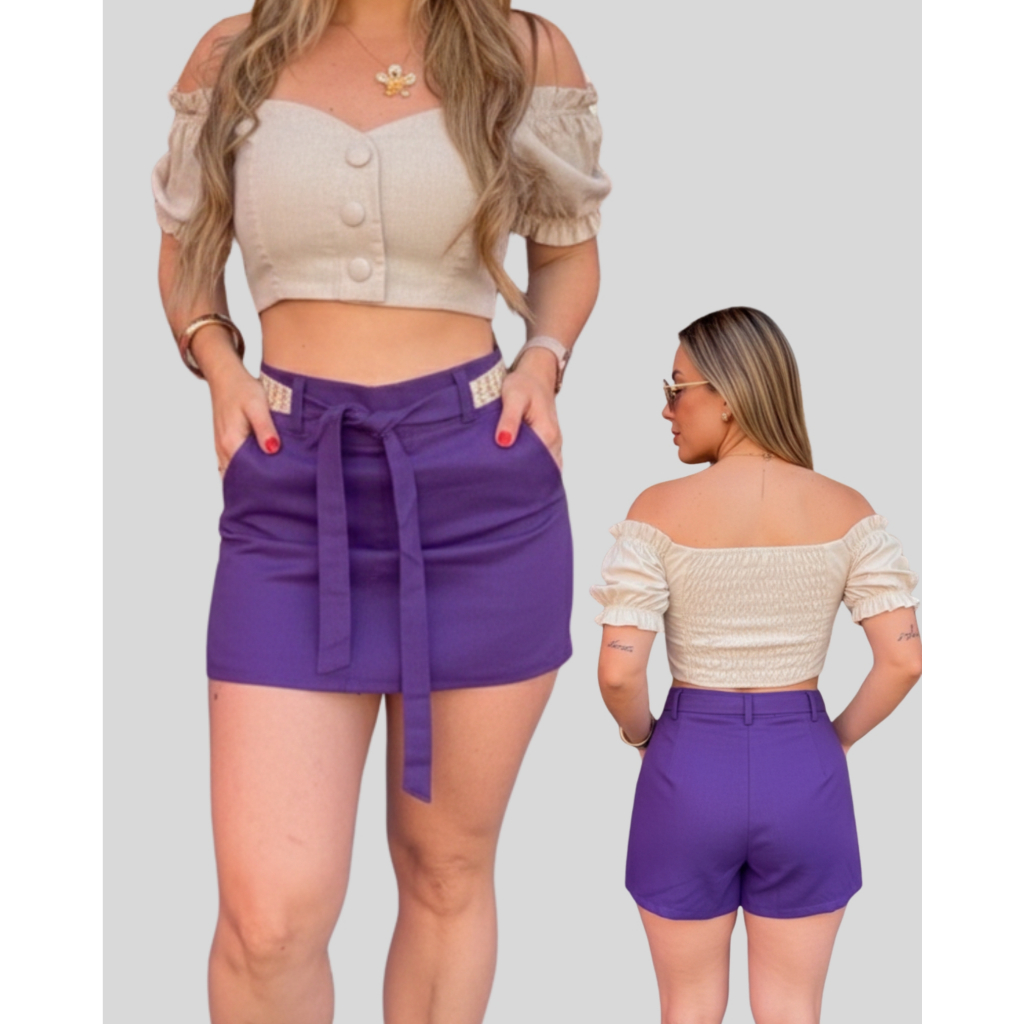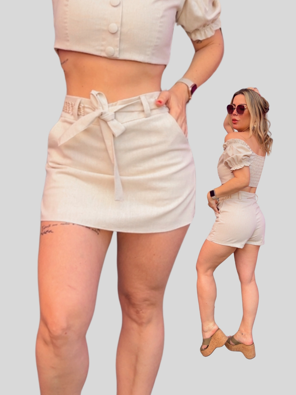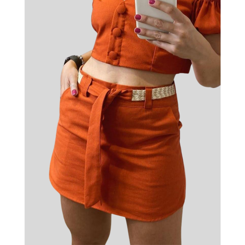 Short Saia de Linho com Cinto de Palha – Shortsaia Feminina | P M G | Pronta Entrega