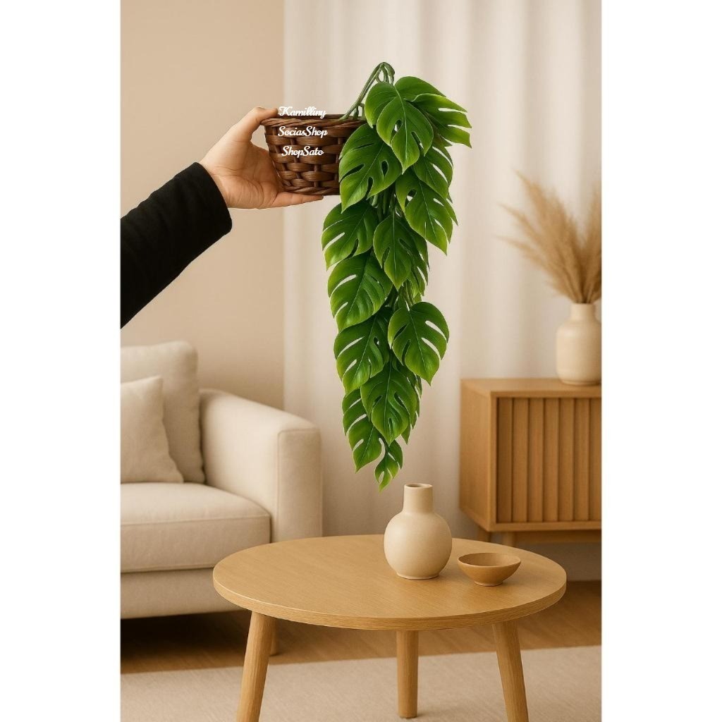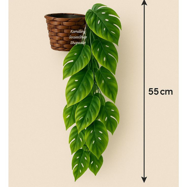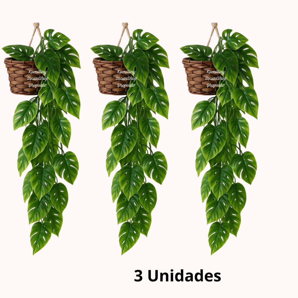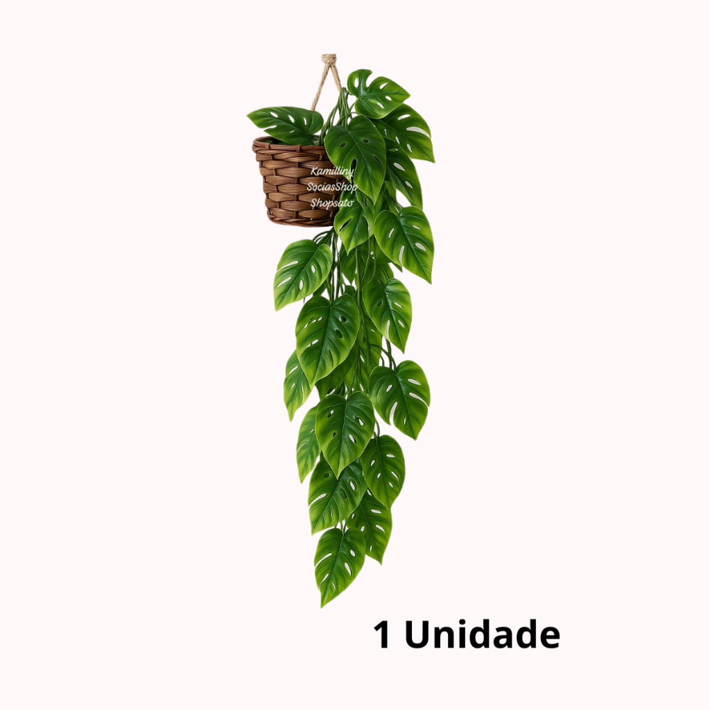 Arranjo Vaso Vime PT11 + Planta Pendurada COSTELA DE ADÃO Verde Artificial Parede Varanda, Decoração Vertical Enfeite