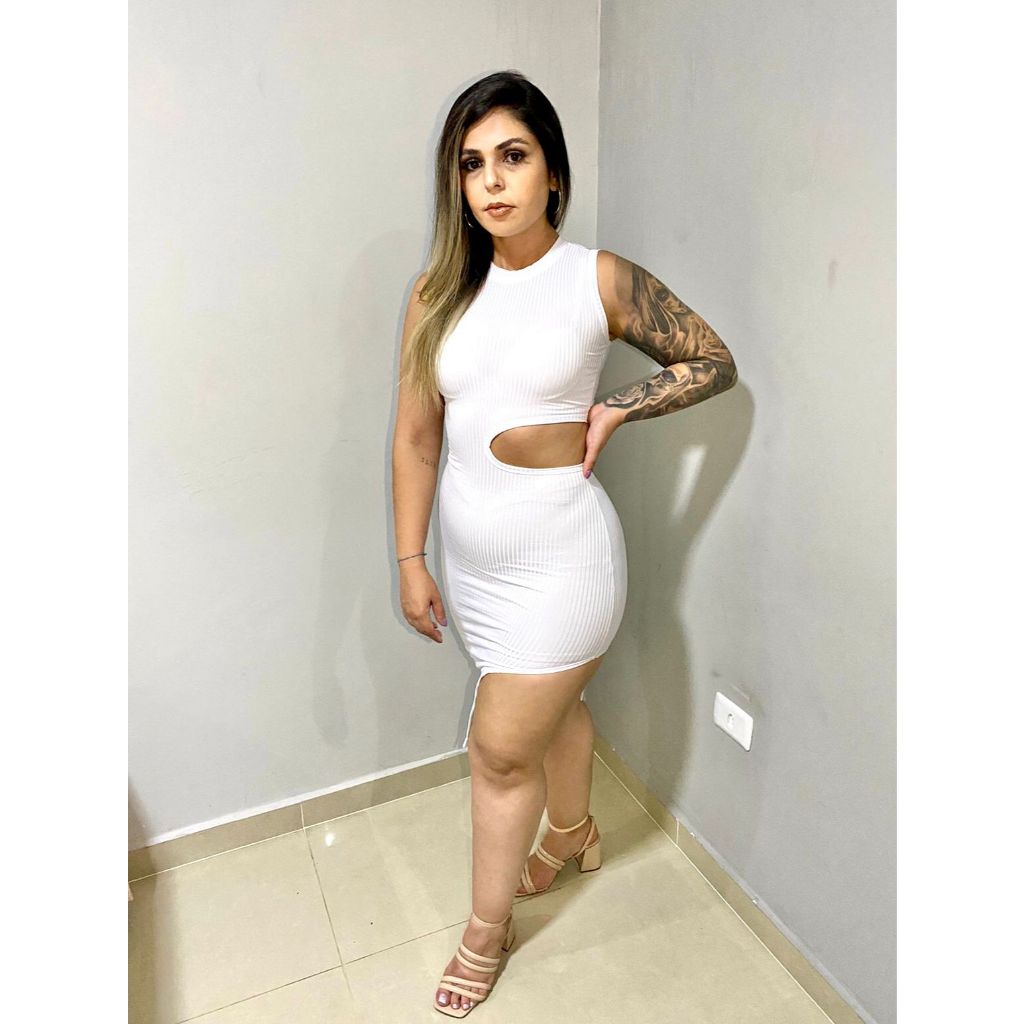 Vestido Feminino Midi Com Fenda Lateral Malha Canelada Roupas Feminina Promoção