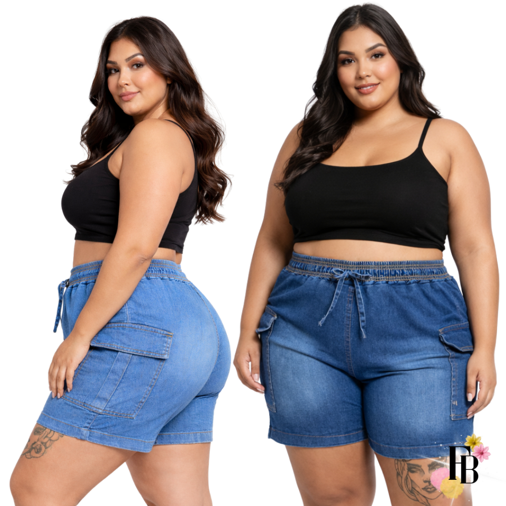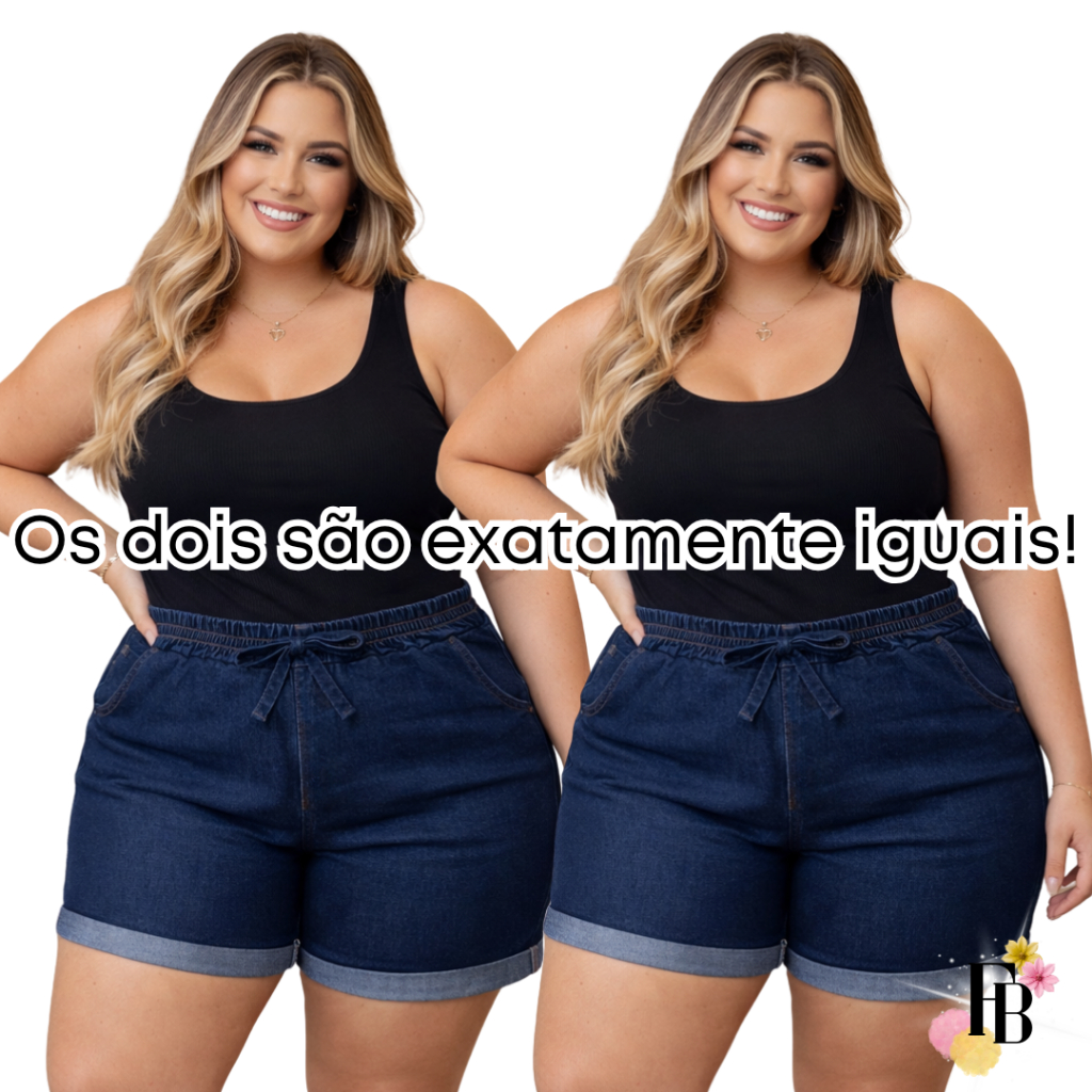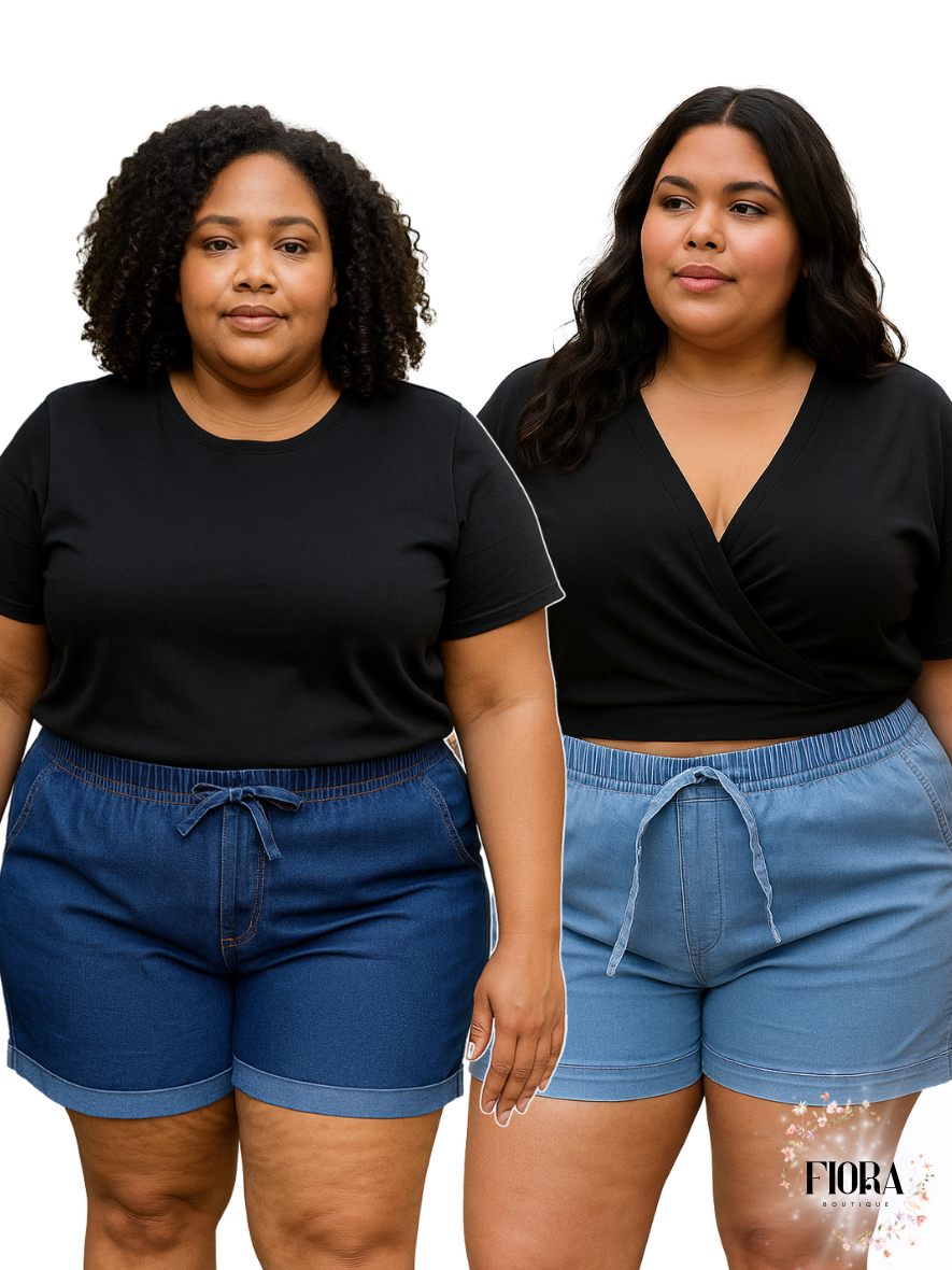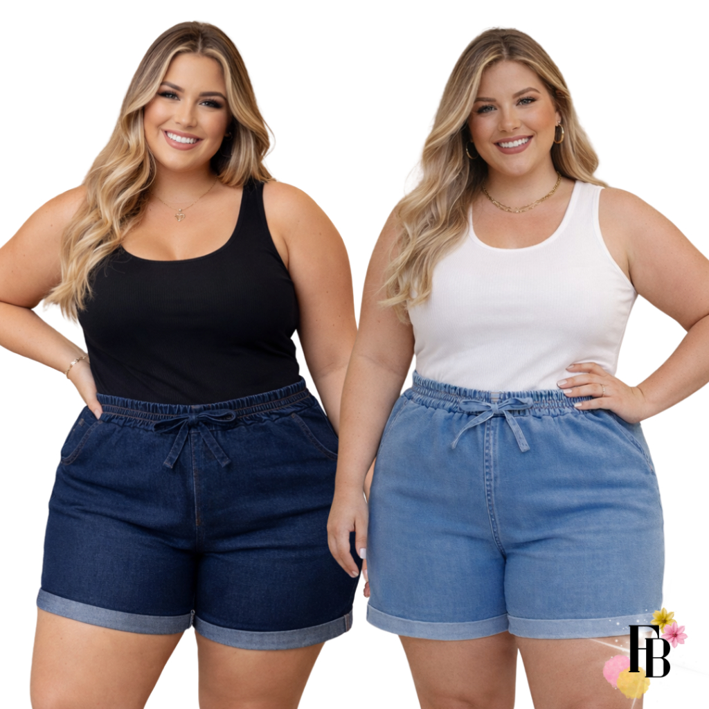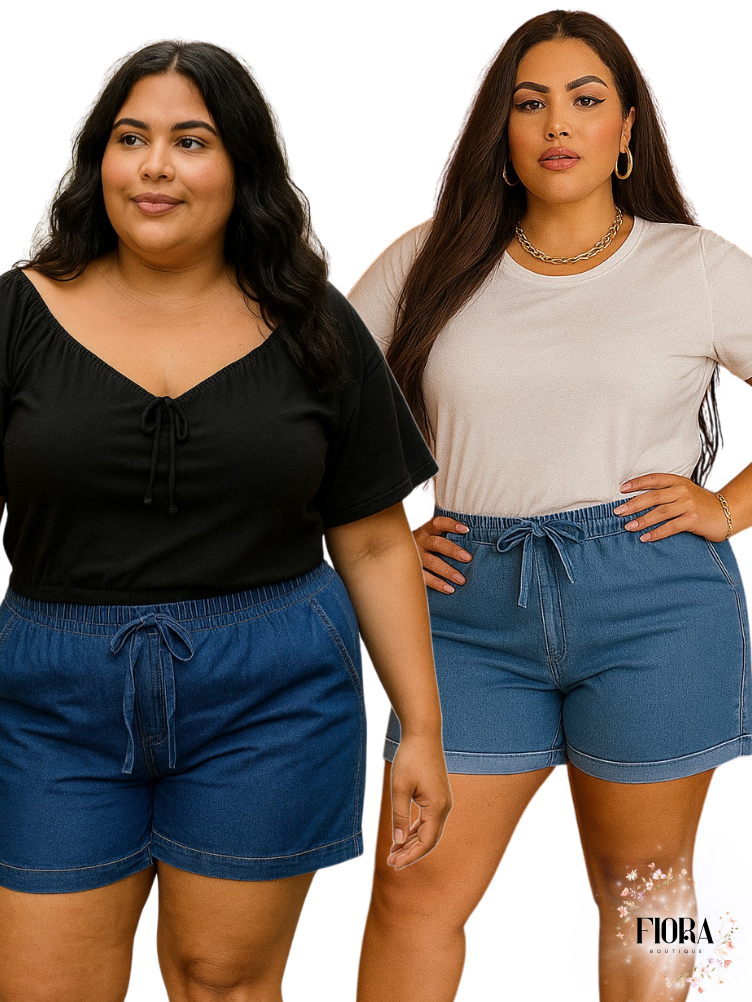Kit 2 Shorts Jeans Feminino Do 42 Ao 56 Plus Size Com Lycra Cintura Alta Laço Verão Confortavel