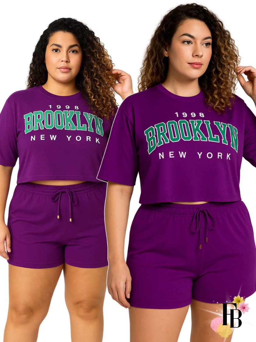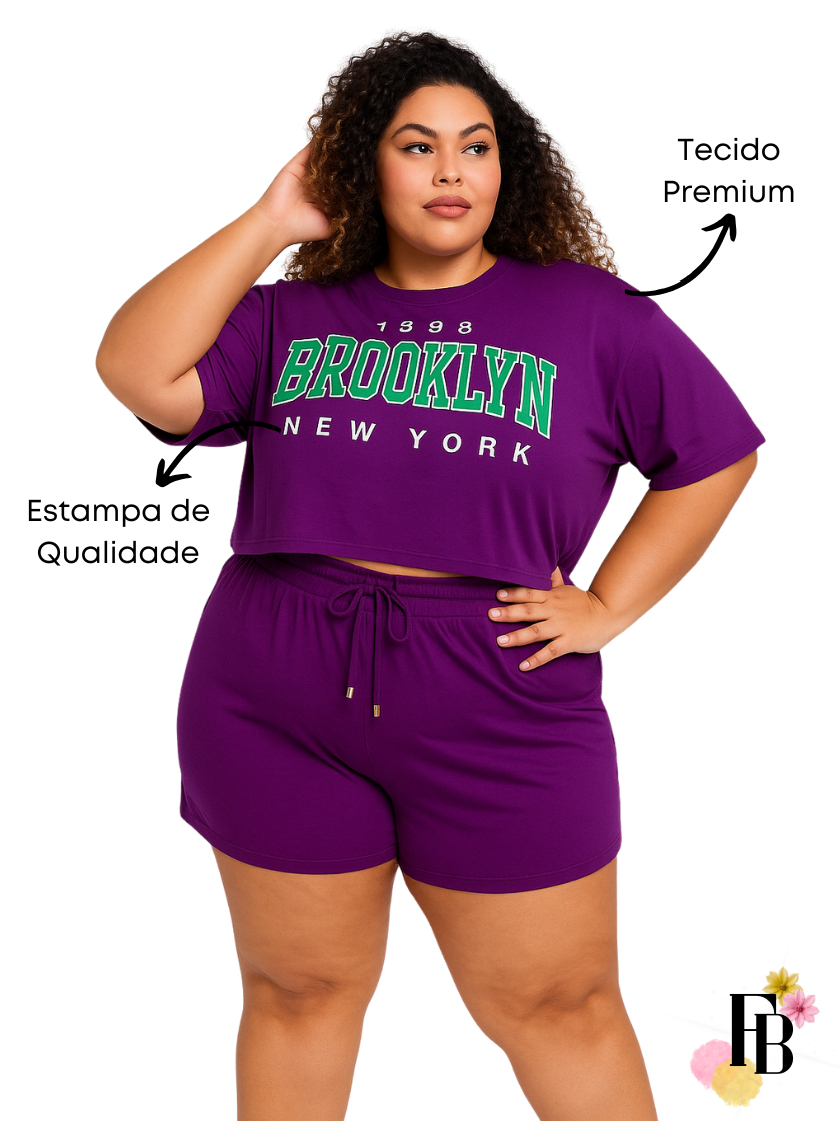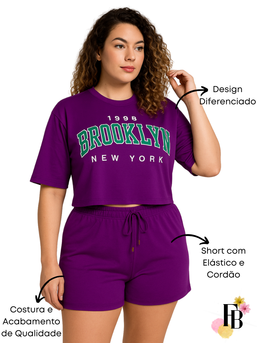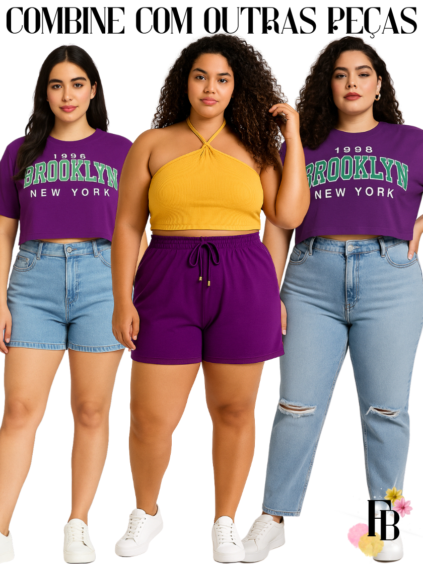 Conjunto Feminino do 38 ao 54 Plus Size Estiloso Cropped e Short 100% Algodão Verão Roxo Estampado