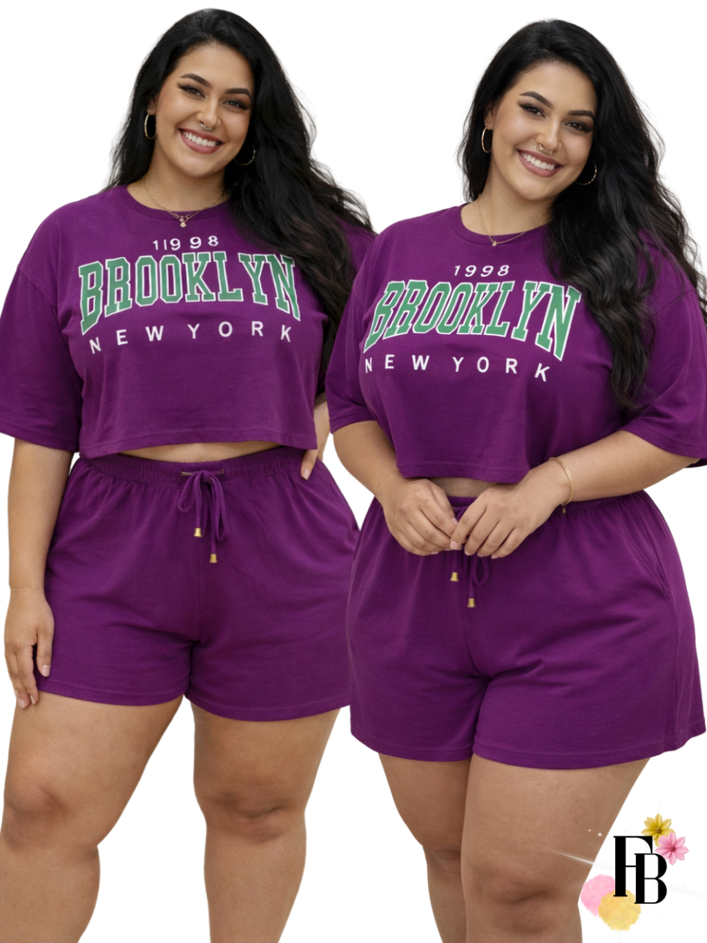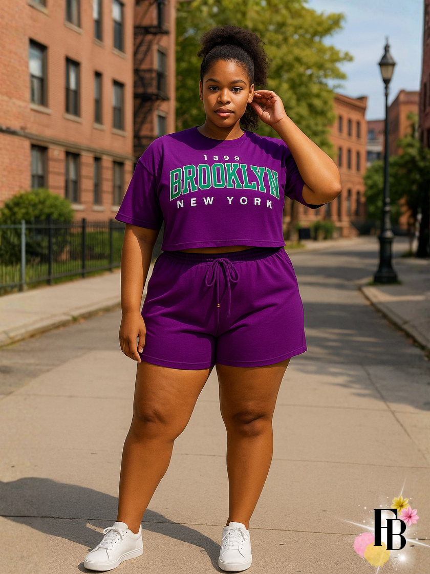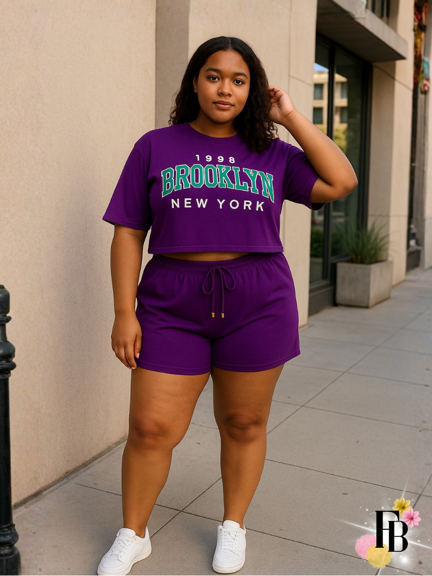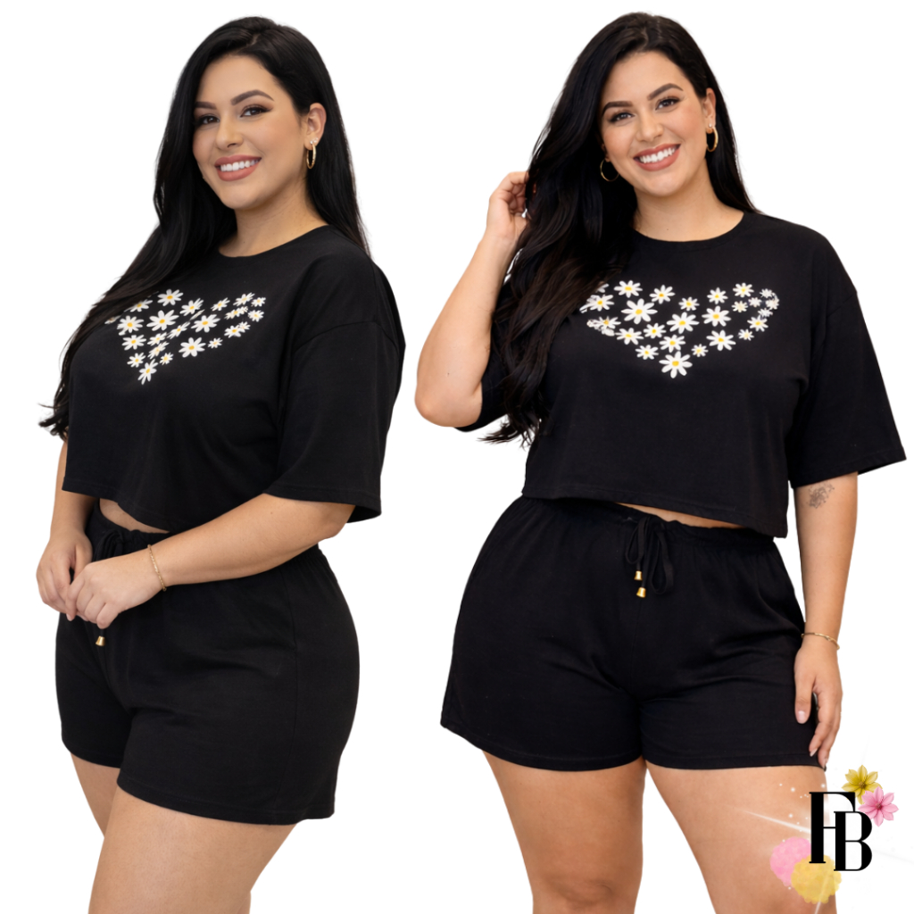 Conjunto Feminino do 38 ao 54 Plus Size Estiloso Cropped e Short 100% Algodão Verão Roxo Estampado