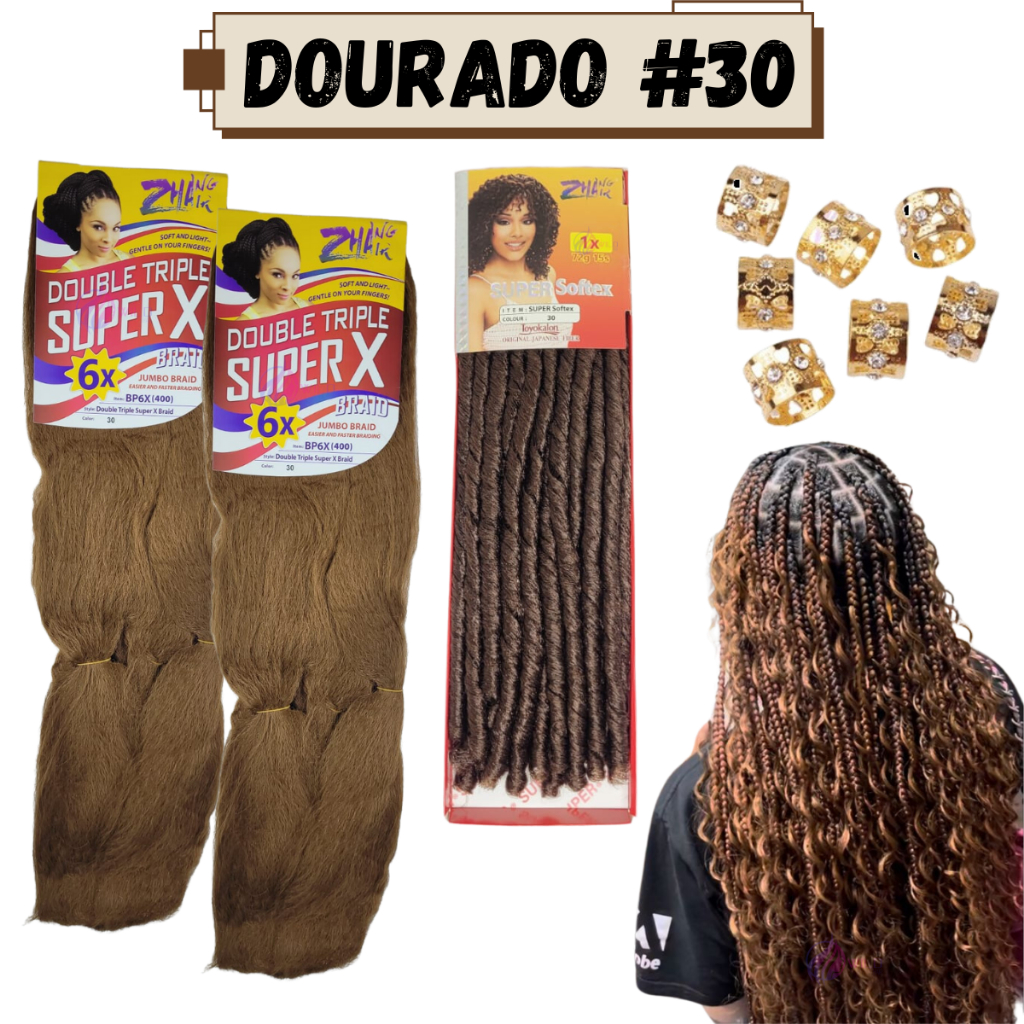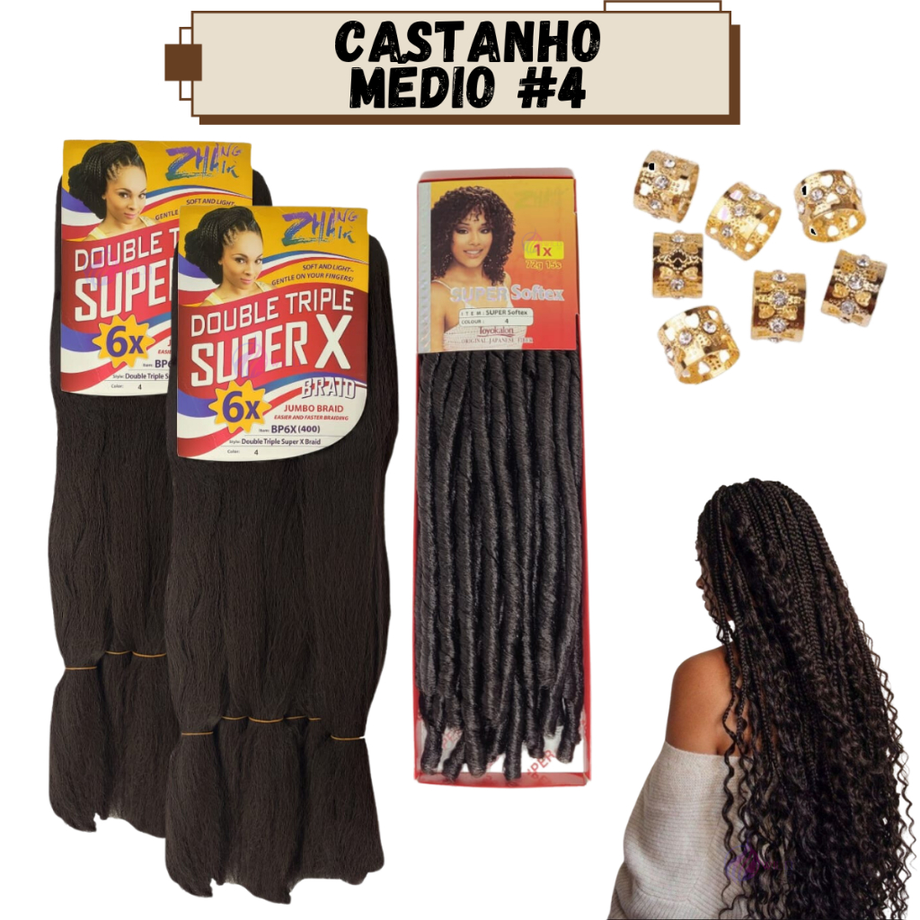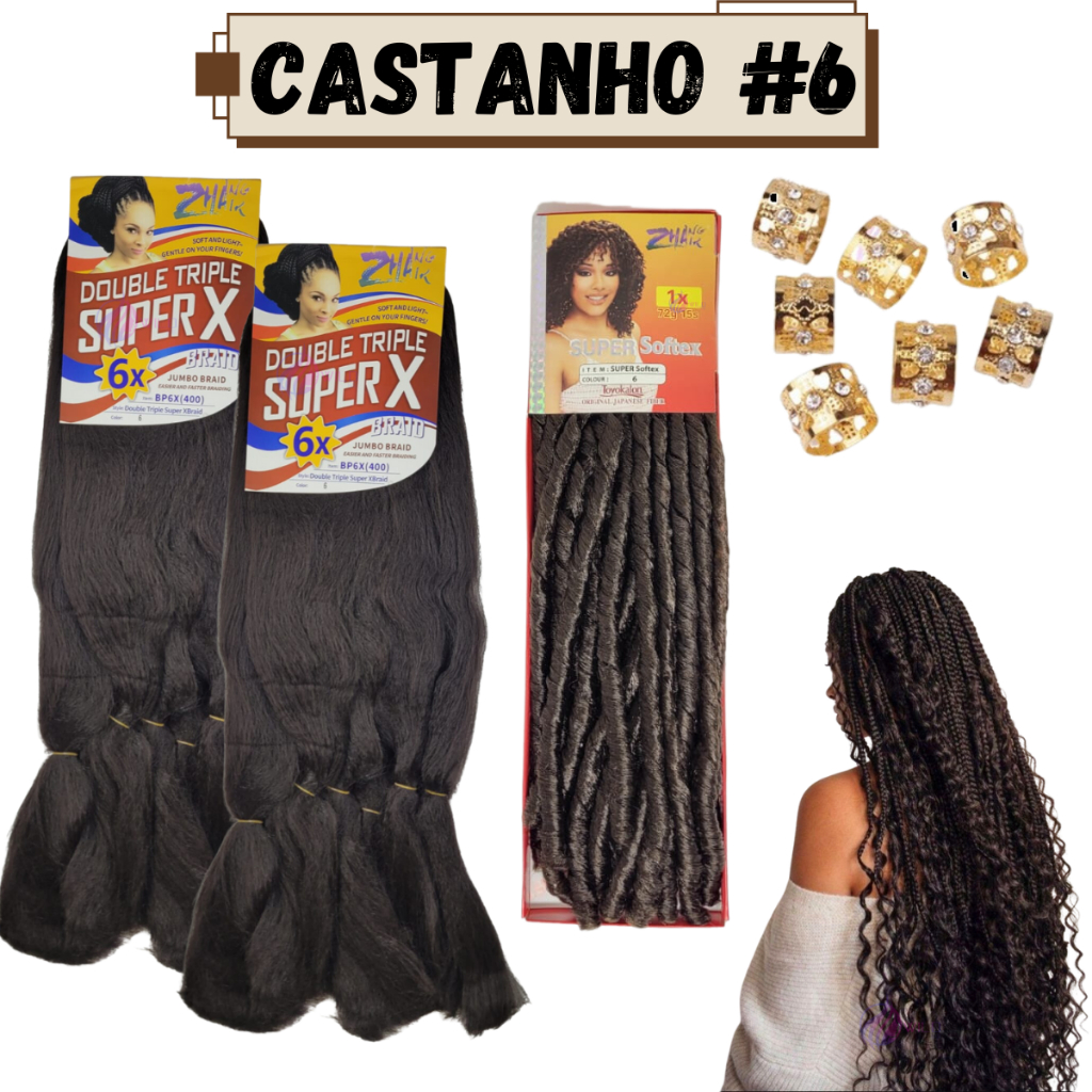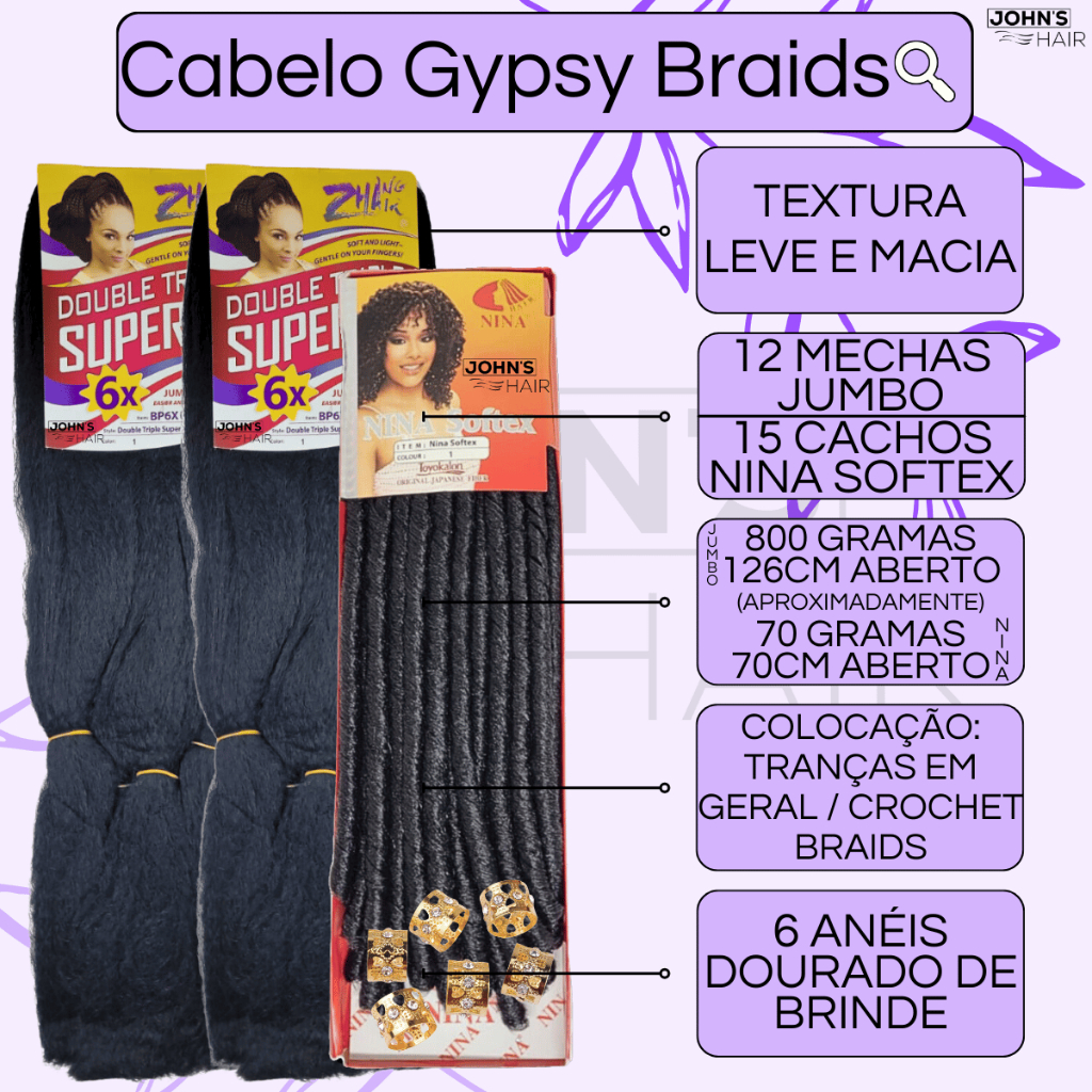 Kit 2 Cabelo Jumbo Jumbão Gypsy Braids Super X Kanekalon Tranças + Nina Softex + Anéis