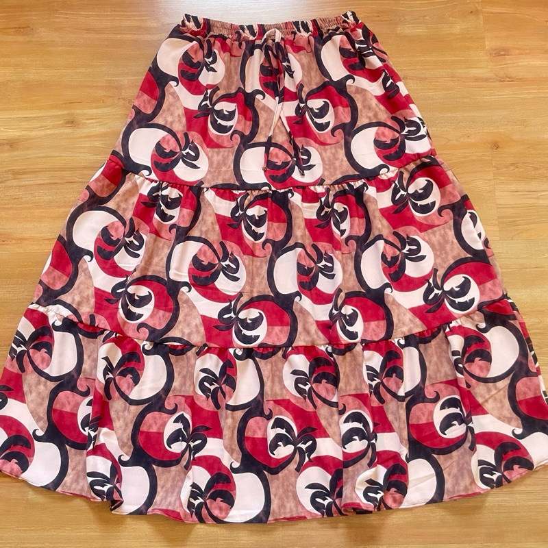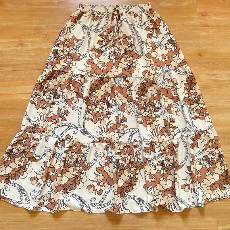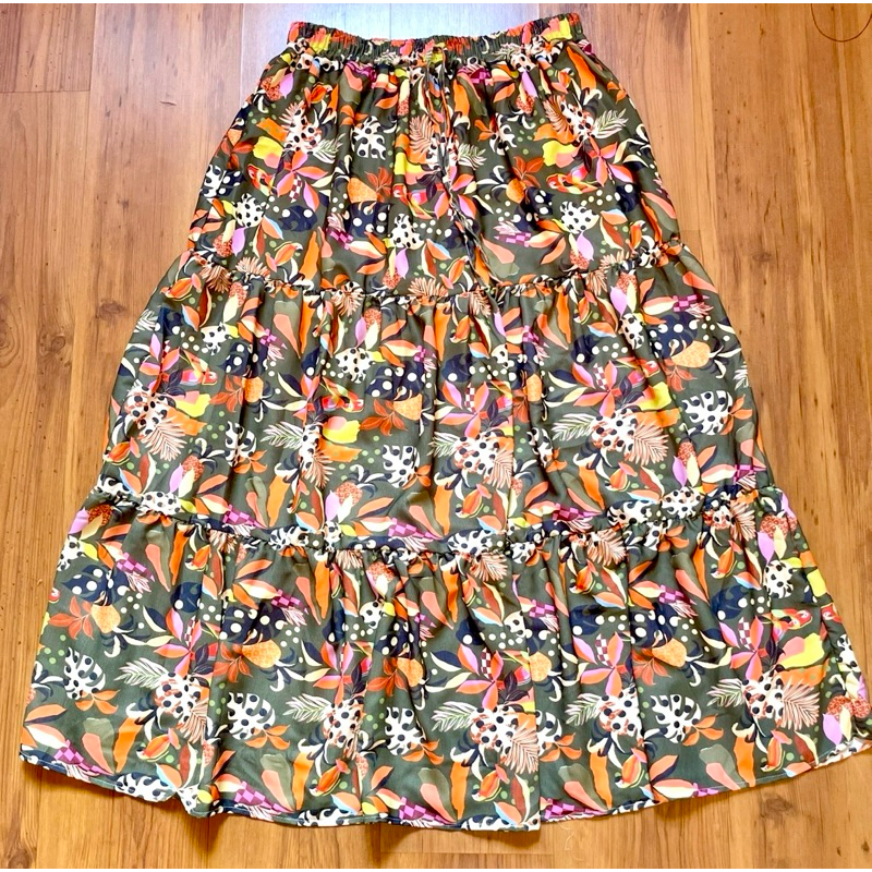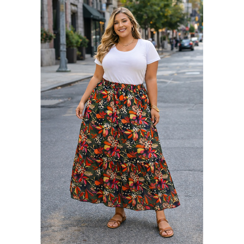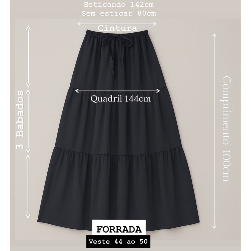Saia longa feminina plus size estampada babado camadas tres marias tecido duna premium elástico.