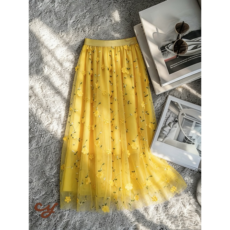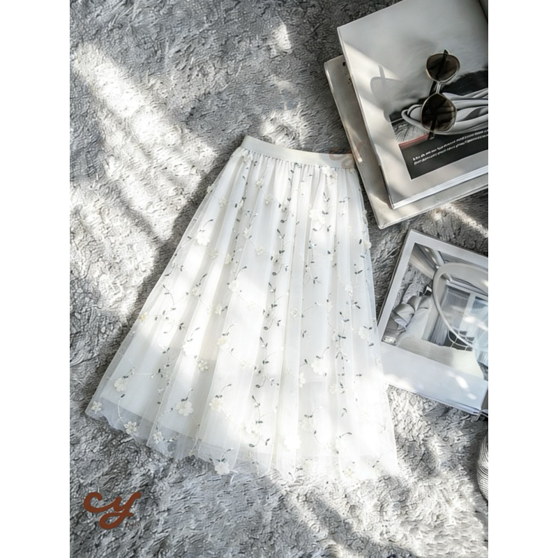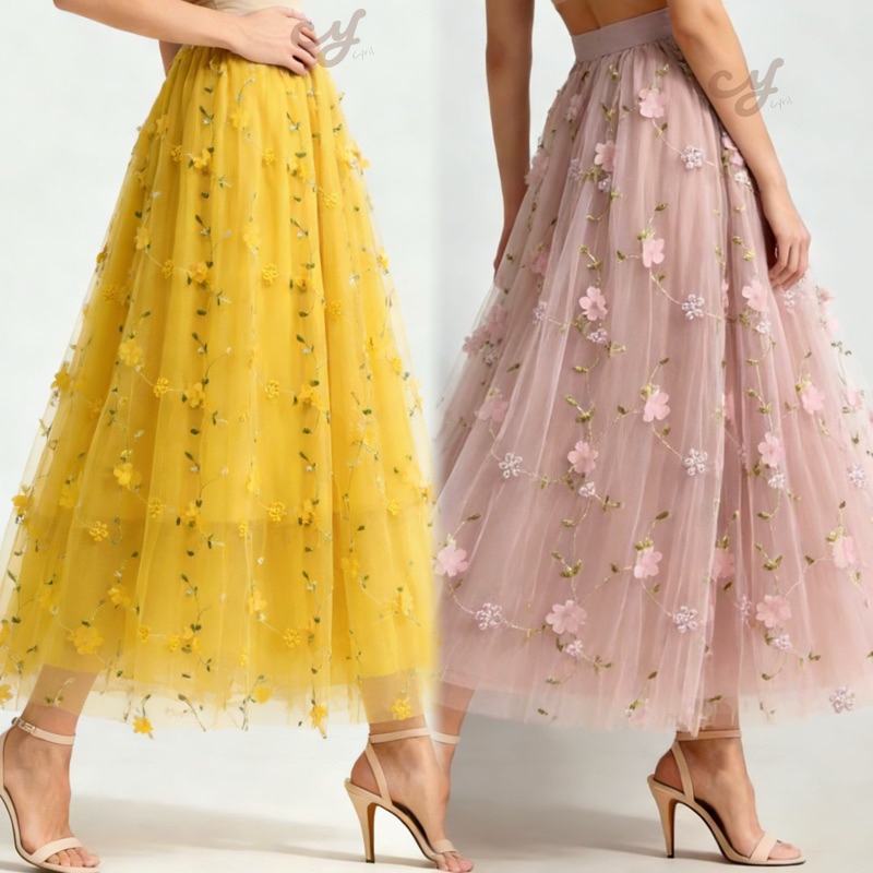 Saia Midi Longa de Tule Plissada bordada com flores 3D–Saia bordada em relevo – Novo modelo---festa Modas