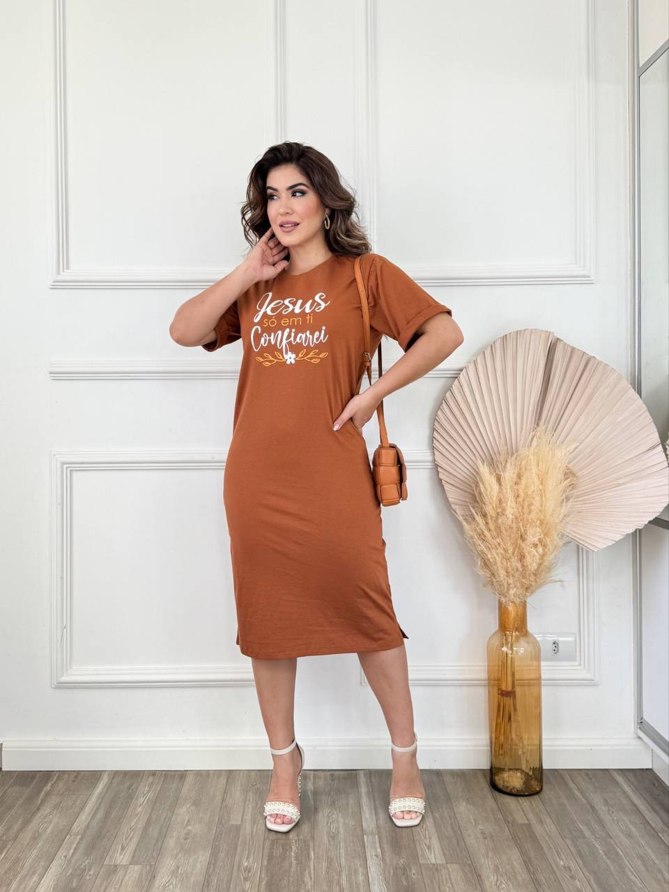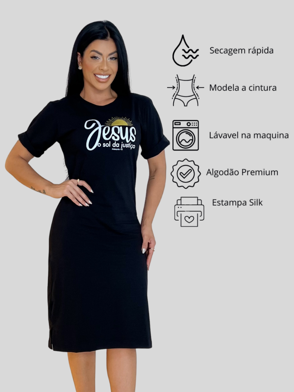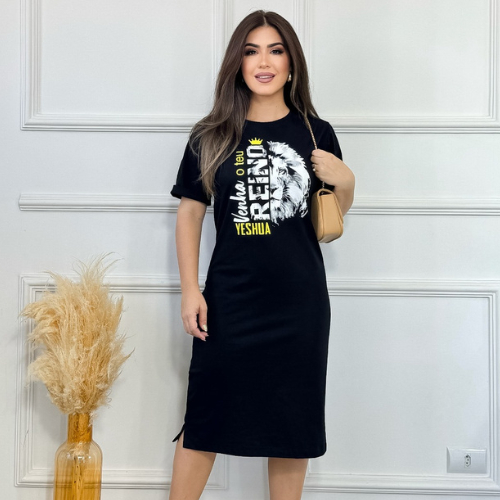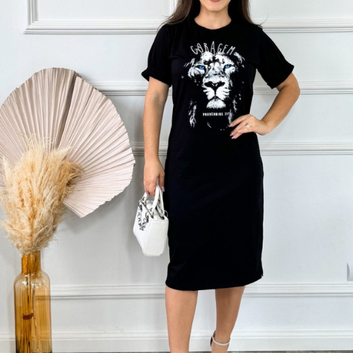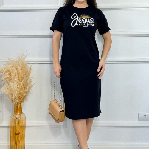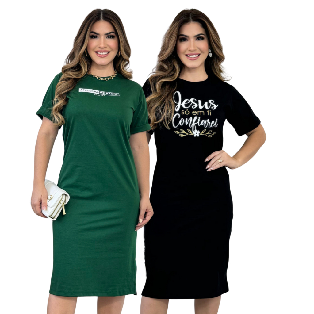 Vestido Midi Feminino 100% Algodão Premium Gola Redonda com Fenda