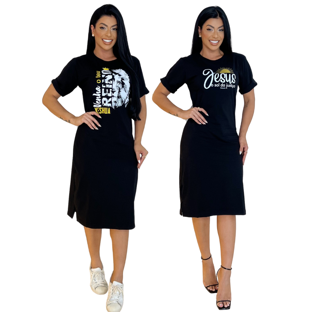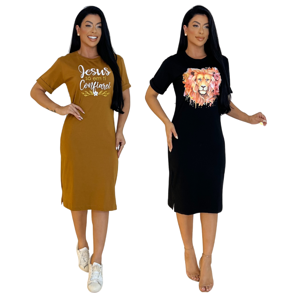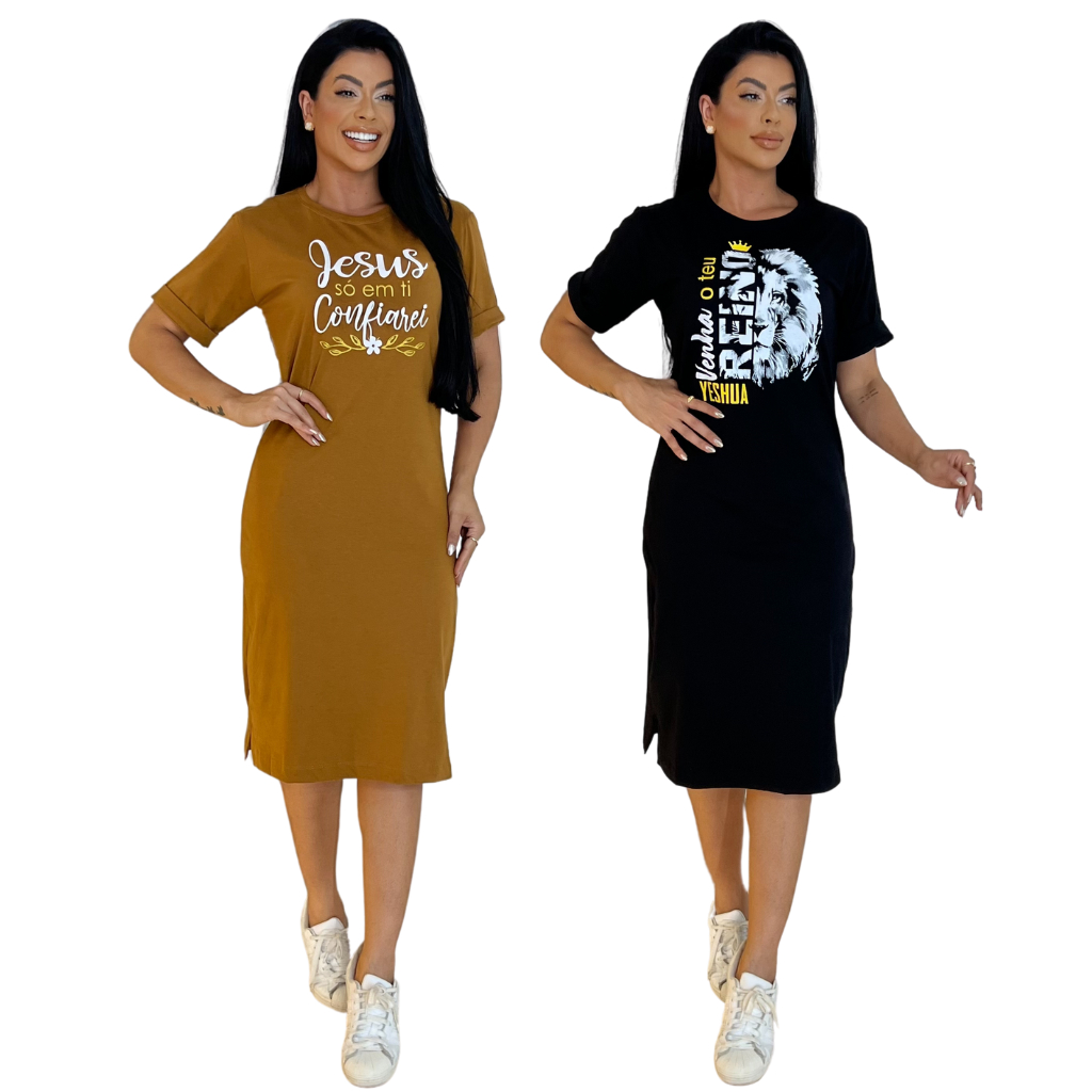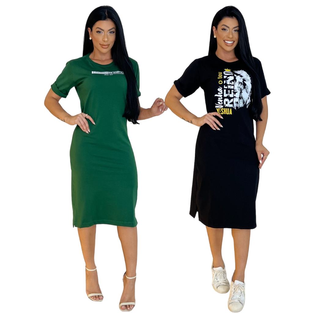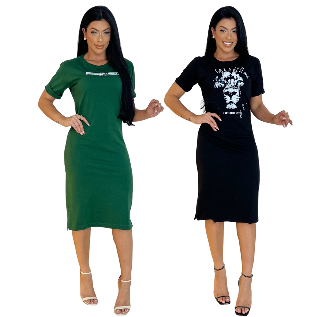 Kit 2 ou 1 Vestidos Midi Feminino 100% Algodão Premium Gola Redonda com Fenda