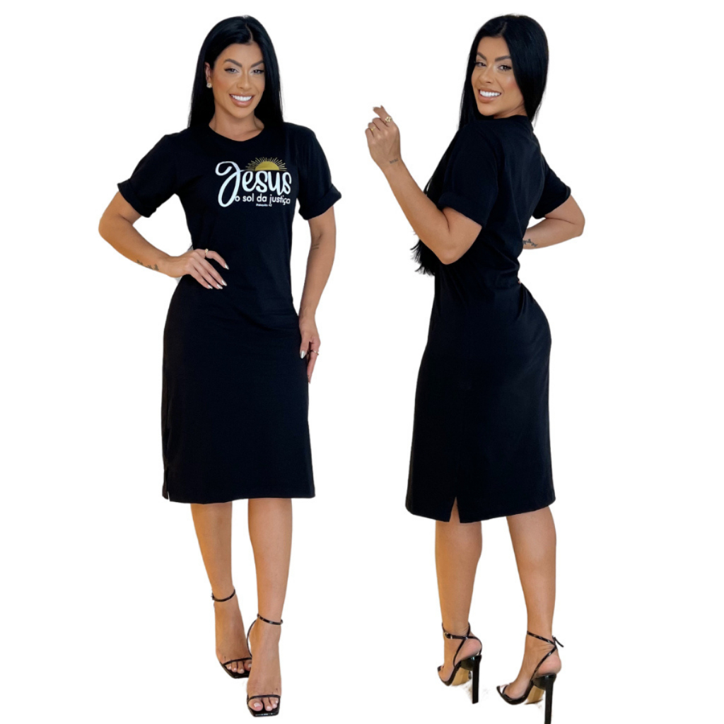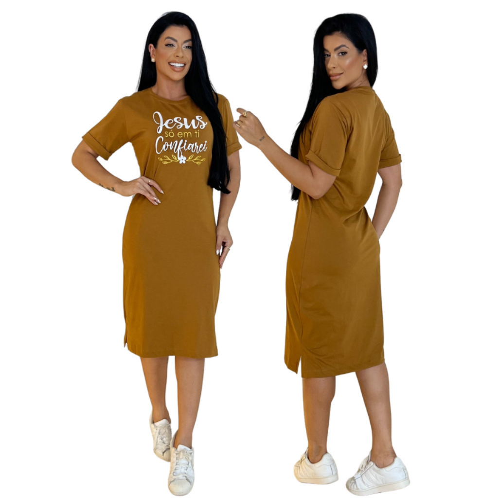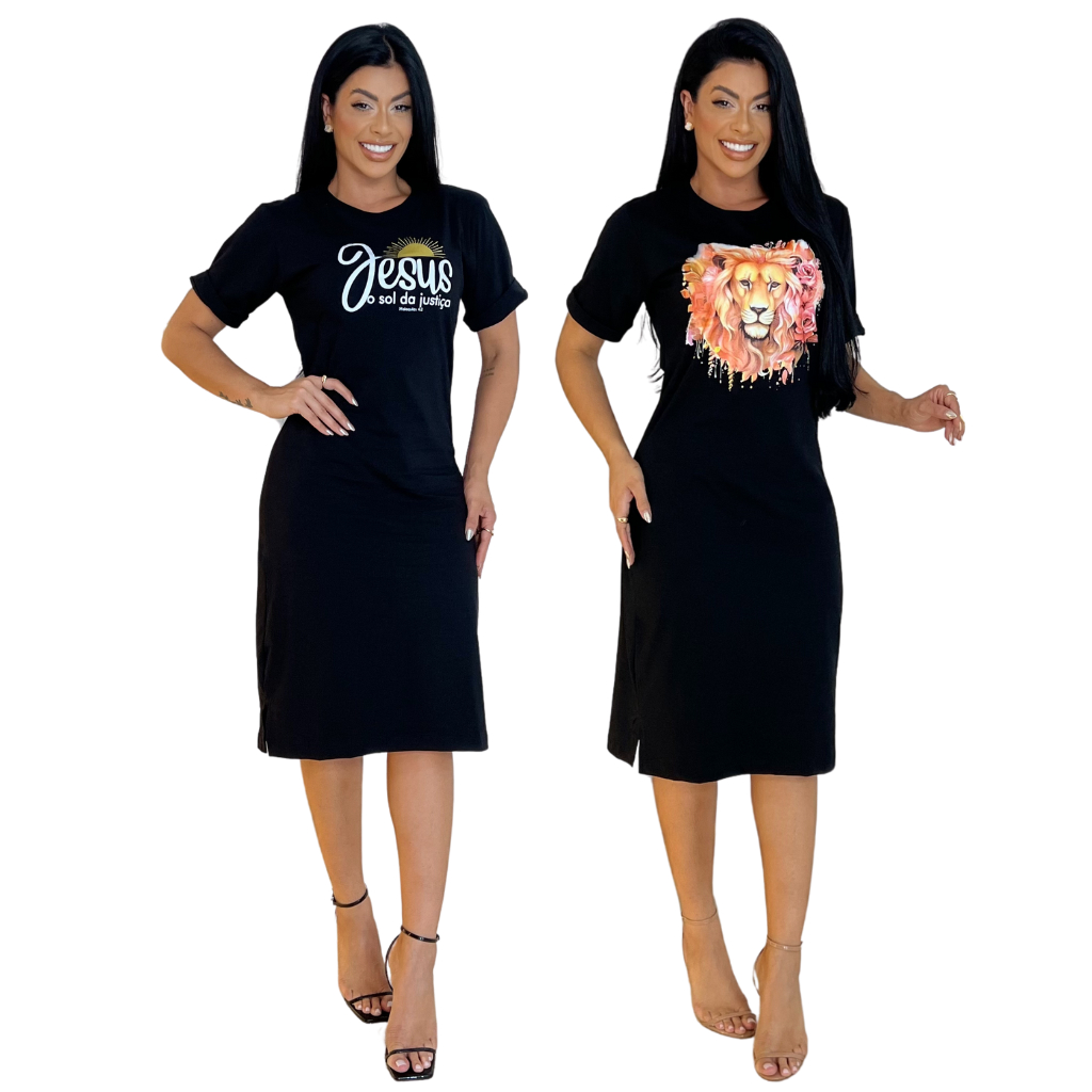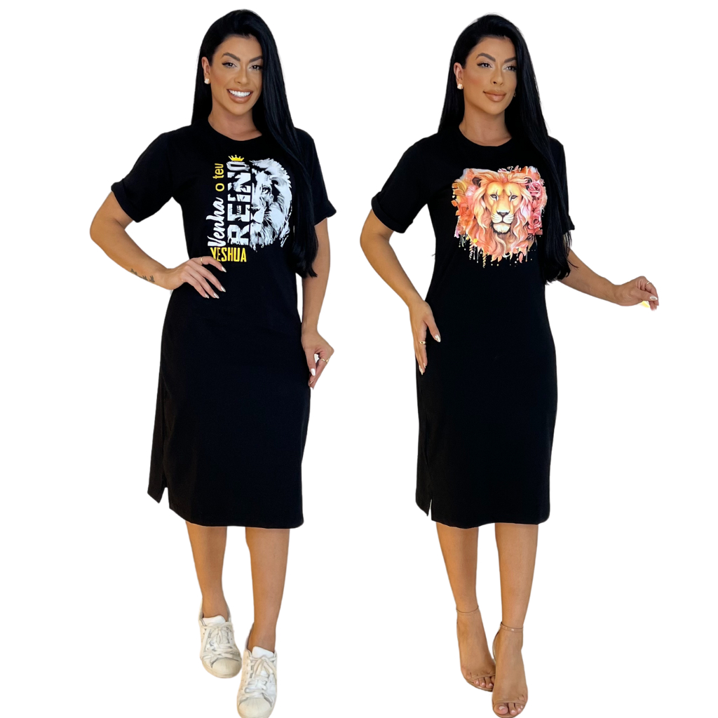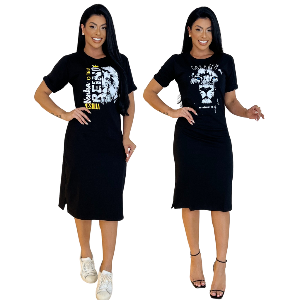 Kit 2 ou 1 Vestidos Midi Feminino 100% Algodão Premium Gola Redonda com Fenda