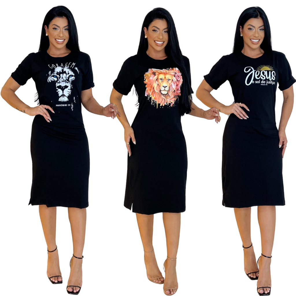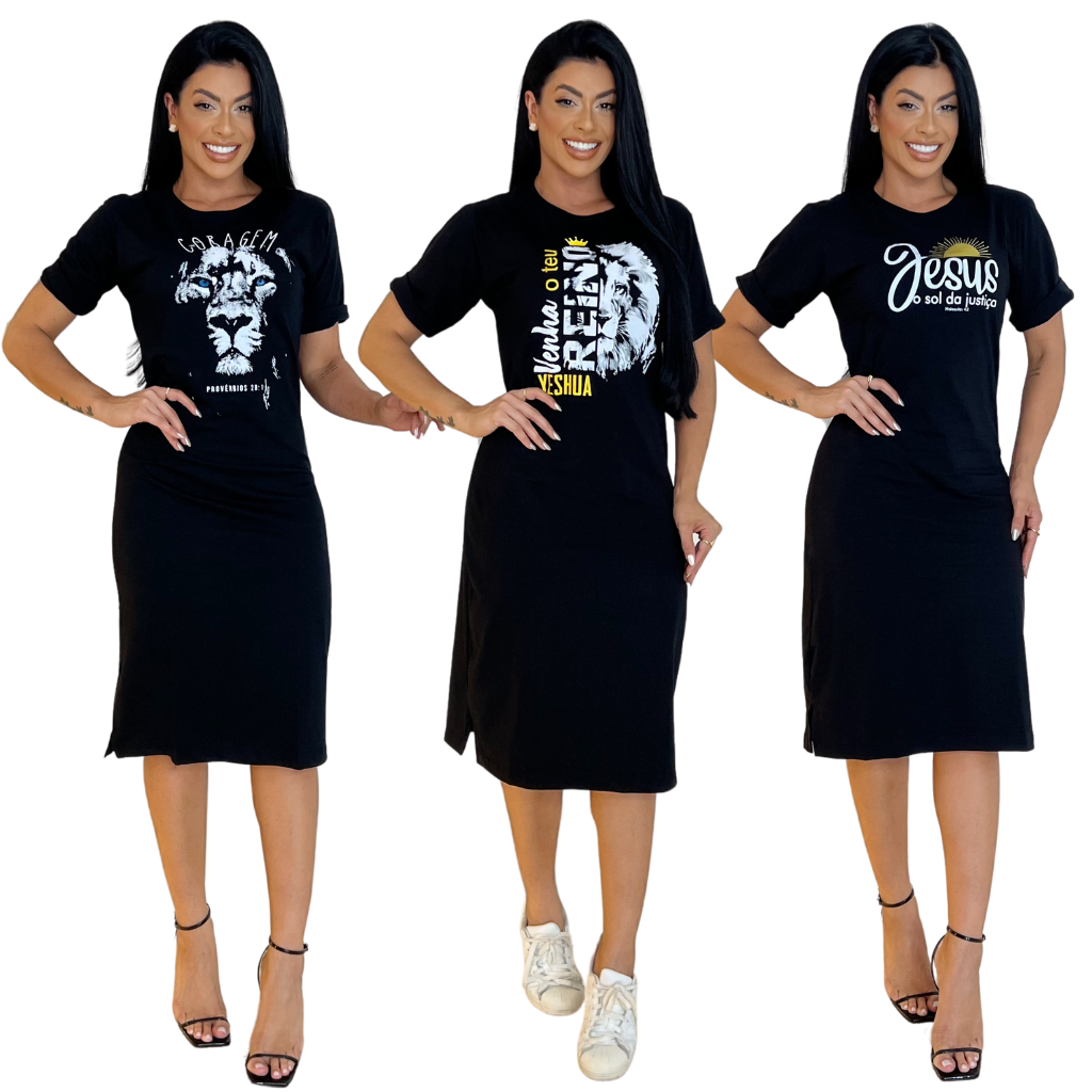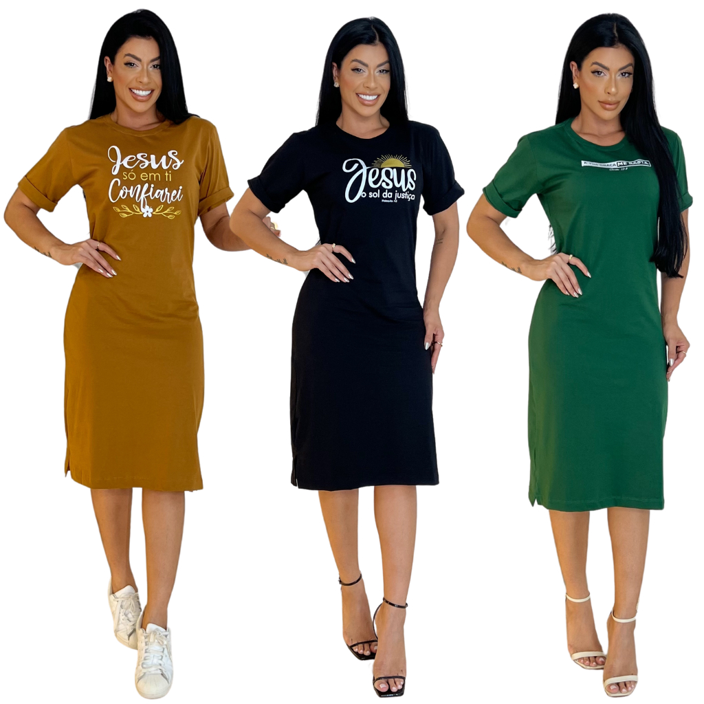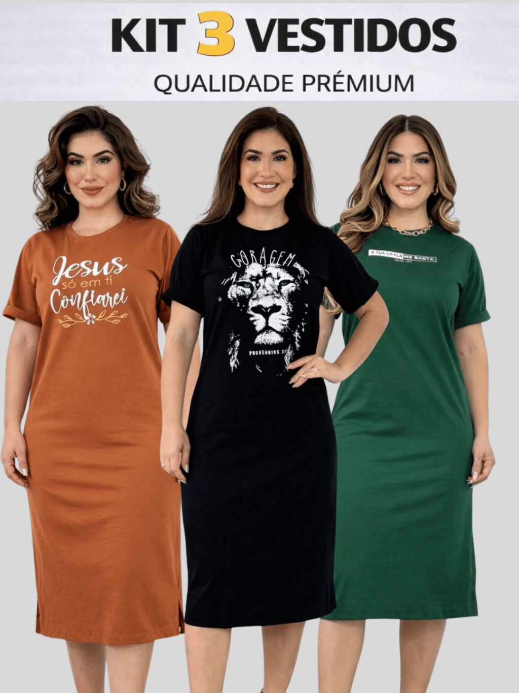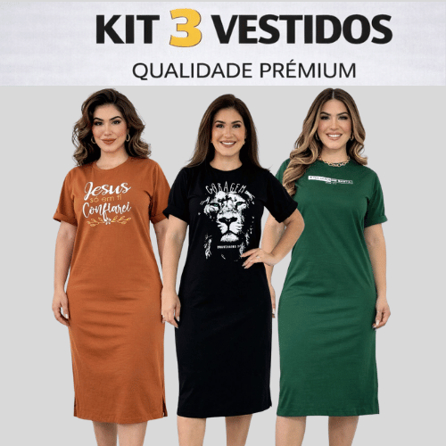 Kit 3 Vestidos Midi Feminino 100% Algodão Premium Gola Redonda com Fenda