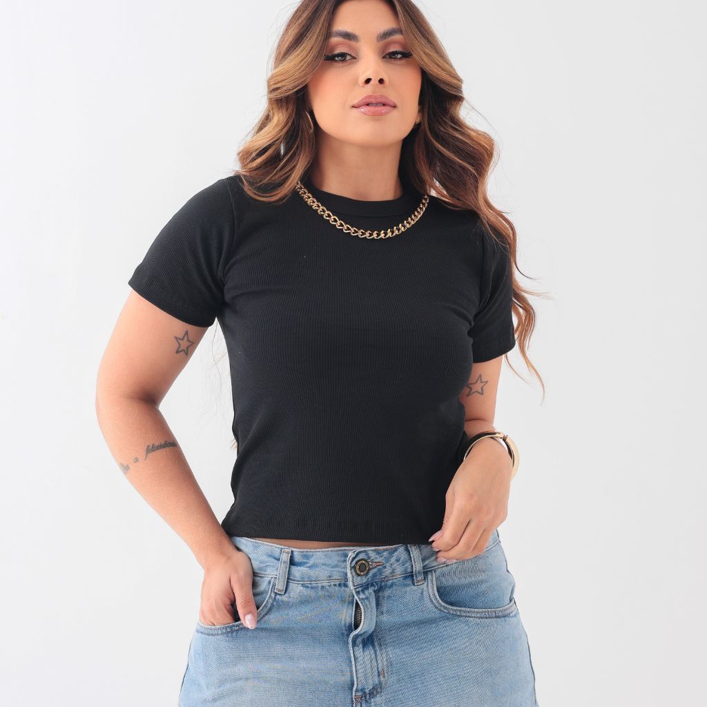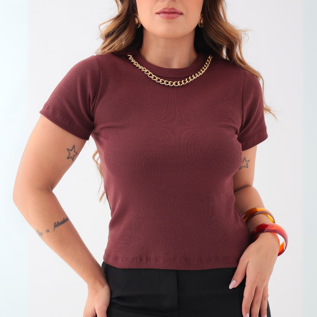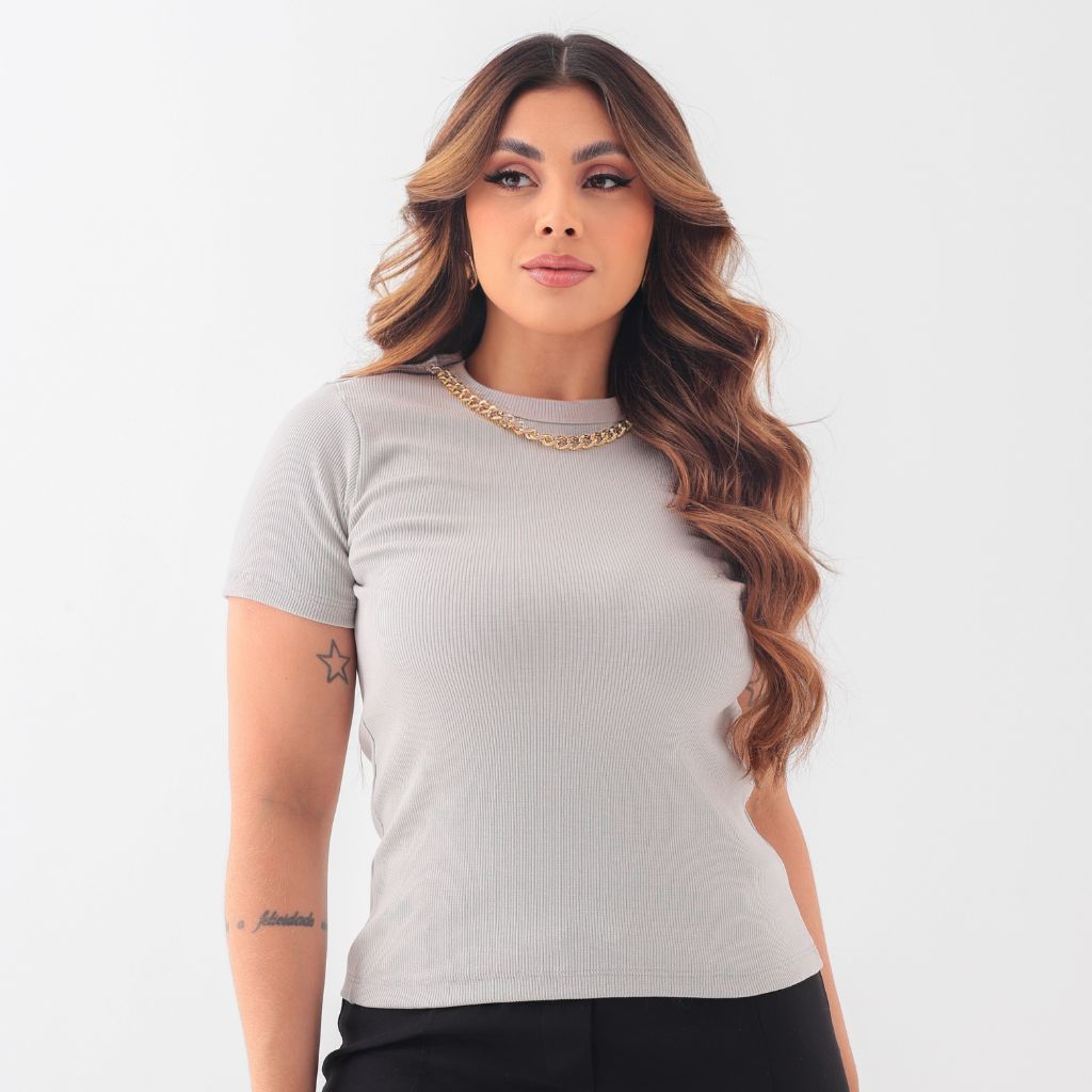 Blusa Camiseta Feminina Detalhe Colar de Corrente T-Shirt Gola Alta
