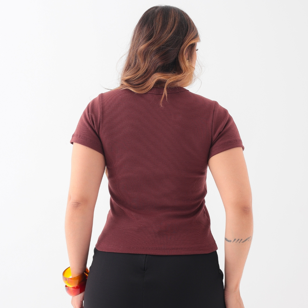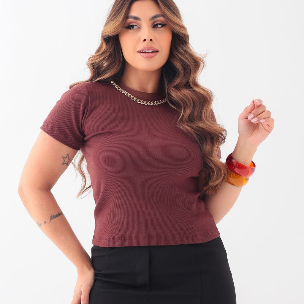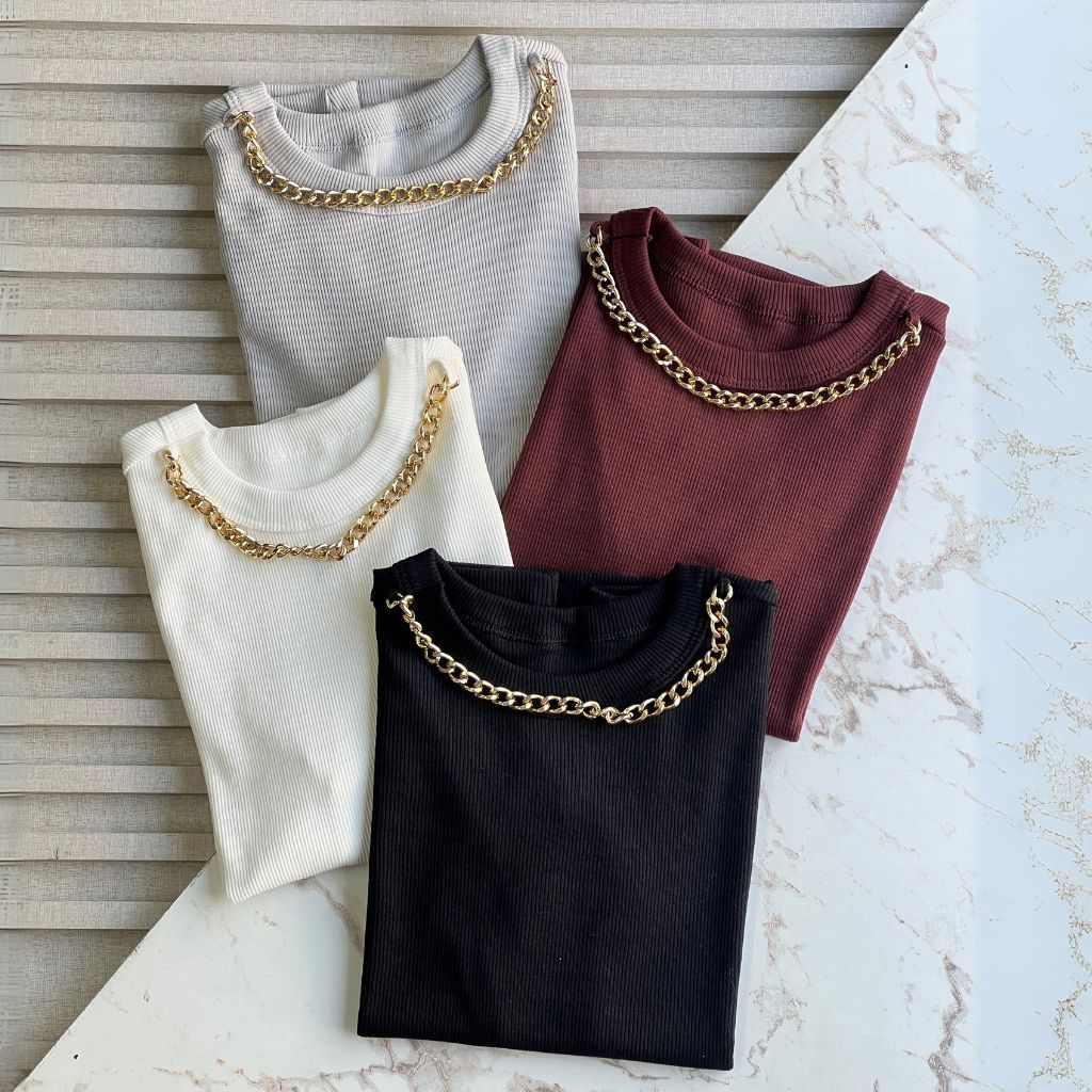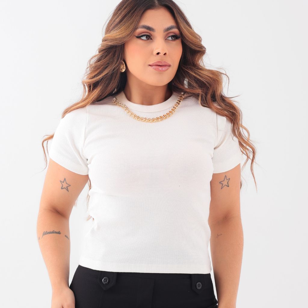 Blusa Camiseta Feminina Detalhe Colar de Corrente T-Shirt Gola Alta
