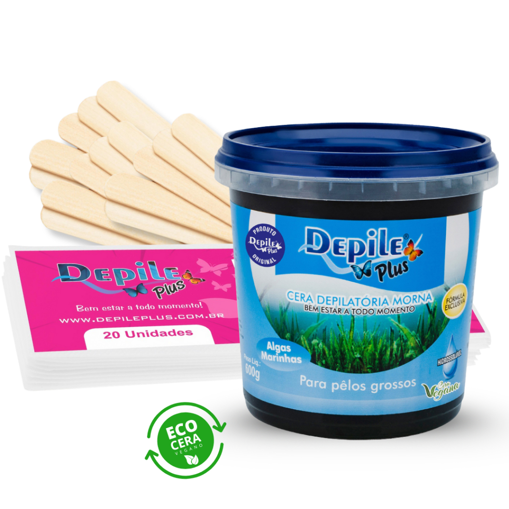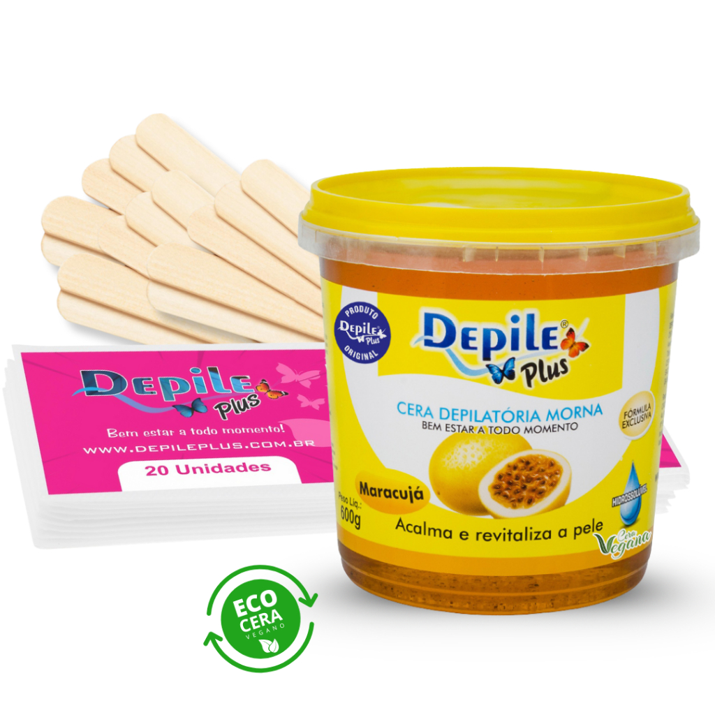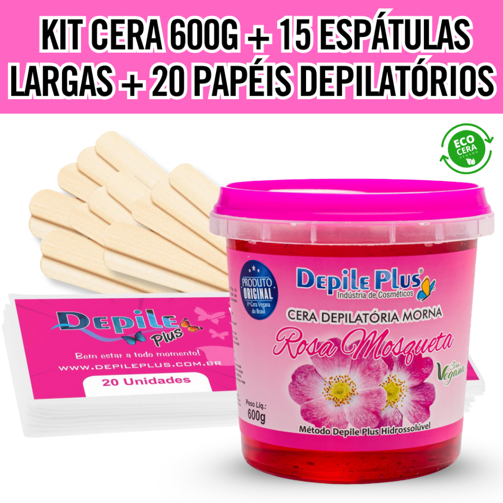 Kit Cera Depilatoria Hidrossoluvel Vegana 600g Espátula Larga 15 Unidades Papel Depilatorio 20 Unidades