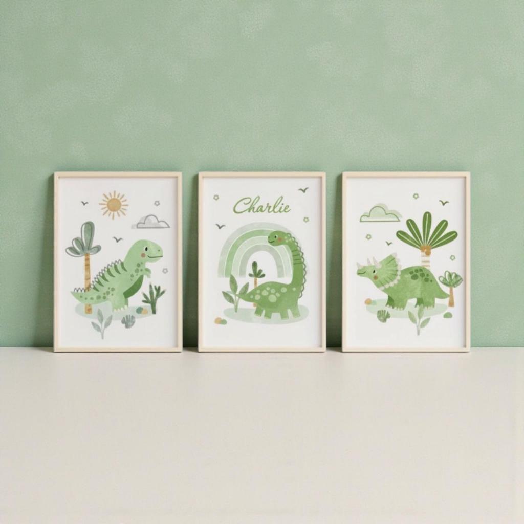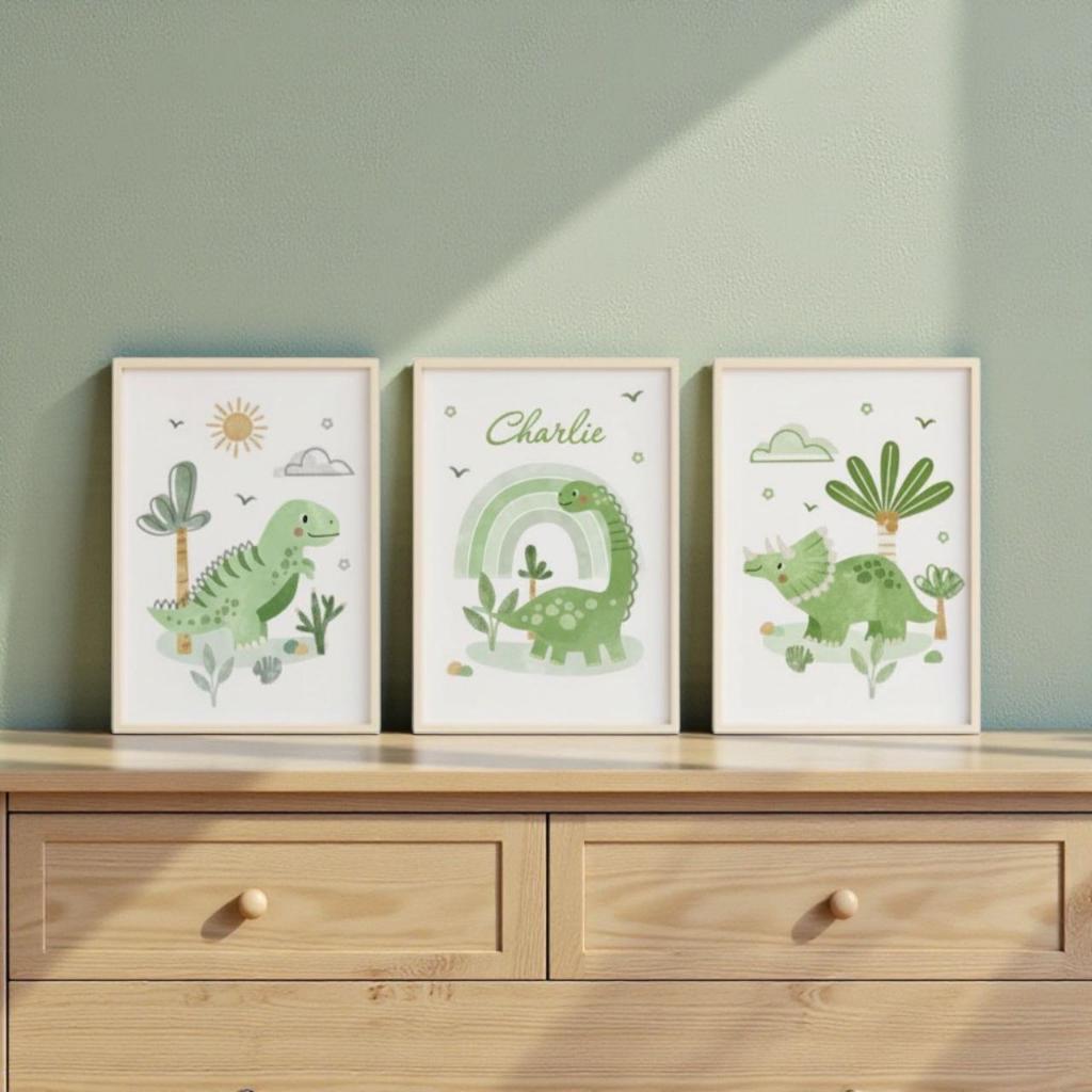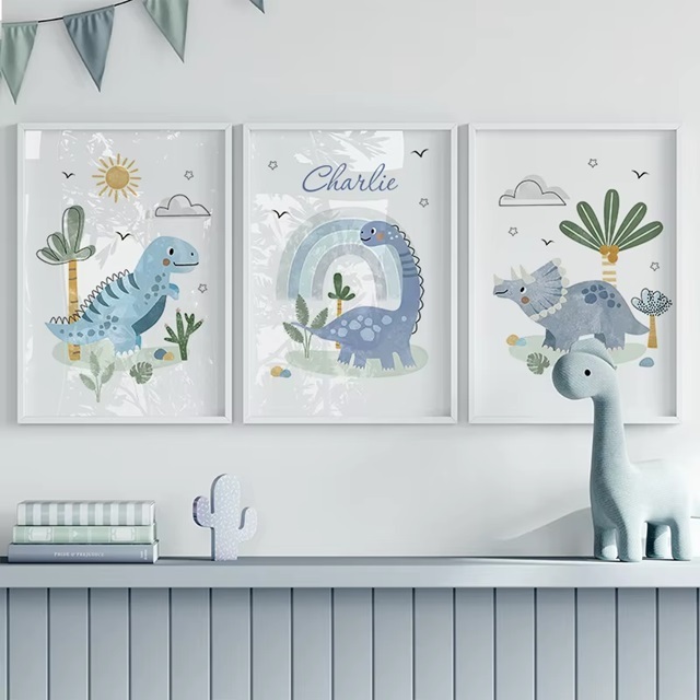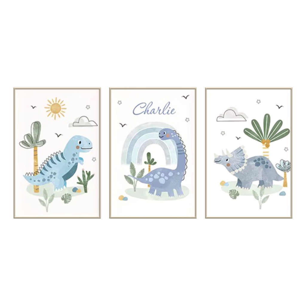 Kit 3 Quadros Decorativos Infantil Dinossauro Azul – Arte Baby com Nome Personalizado