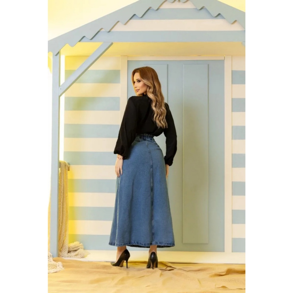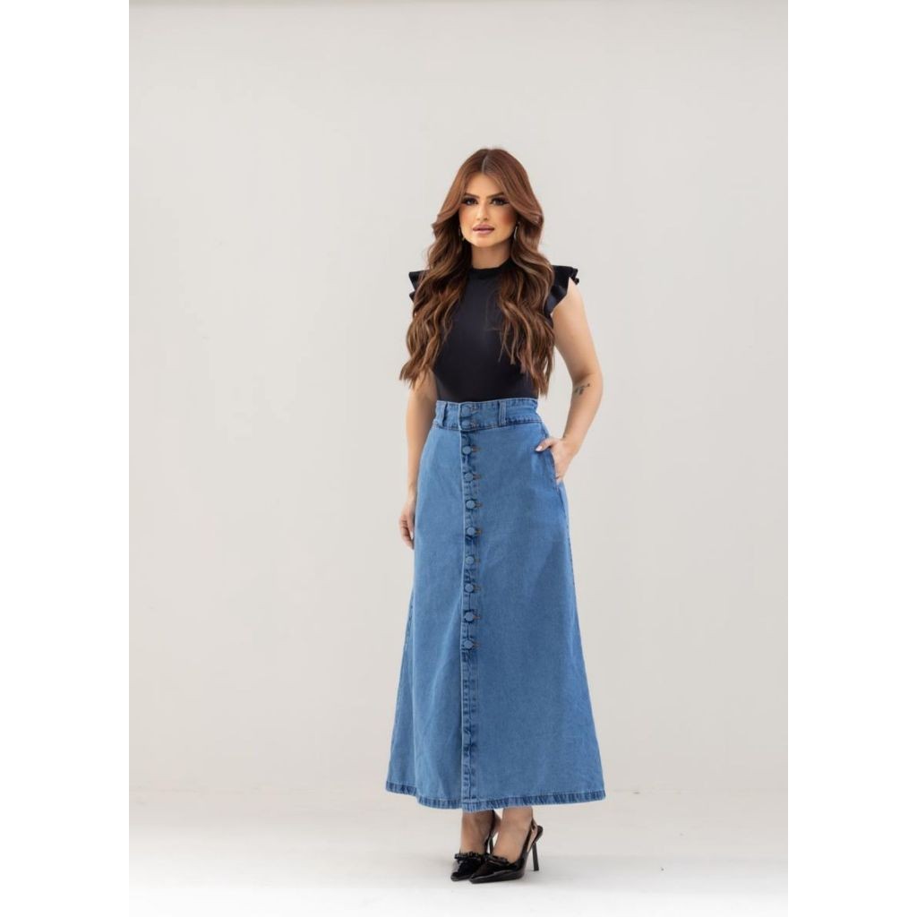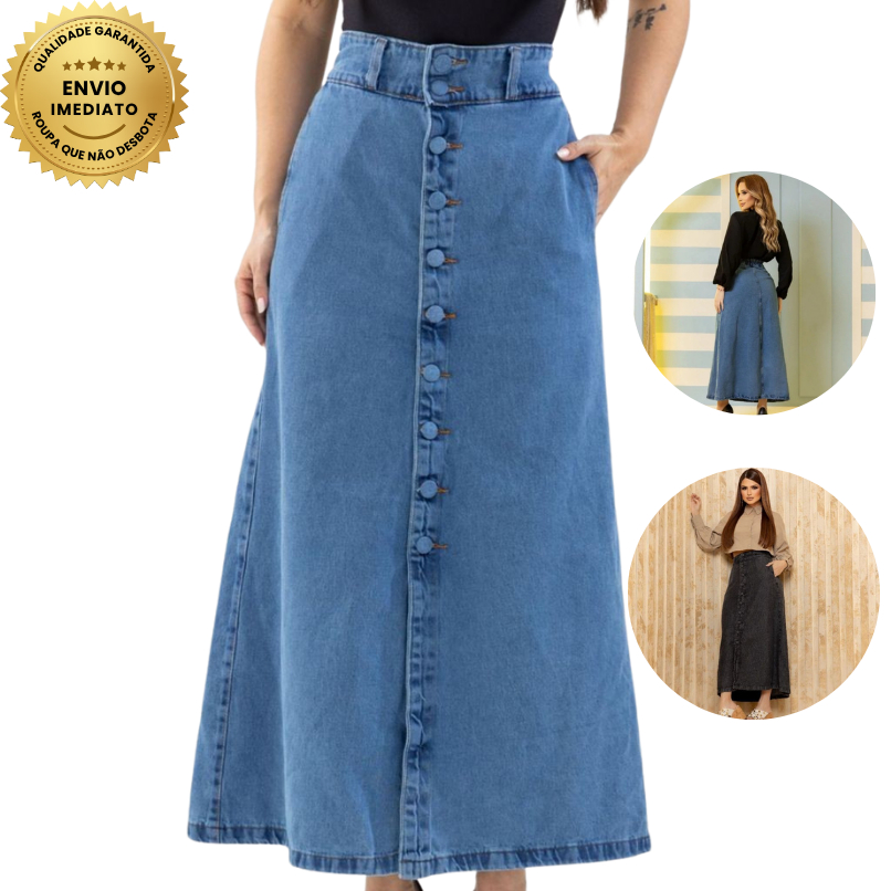 Saia Longa Midi Vintage, Azul Claro ou Azul Escuro Jeans Feminina Cintura Alta com Botões
